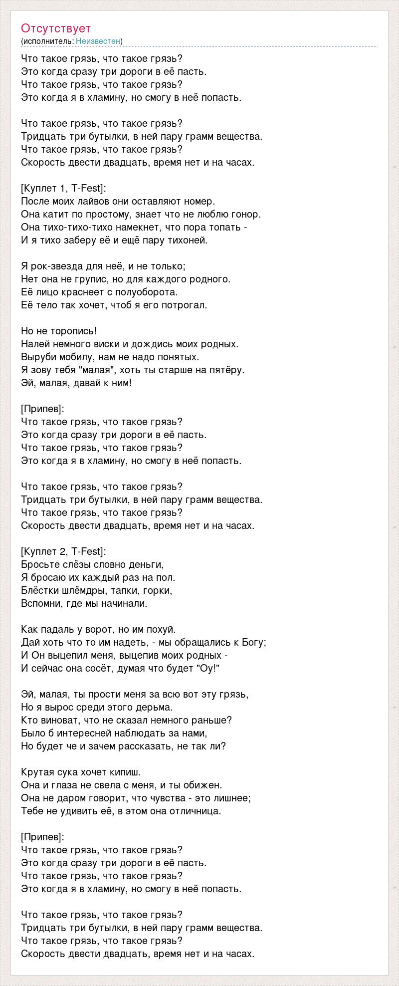 Что такое грязь, что такое грязь? Это когда сразу три дороги в её пасть. Что такое грязь, что такое грязь? Это когда я в хламину, но смогу в неё попасть. Что такое грязь, что такое грязь? Тридцать три бутылки, в ней пару грамм вещества. Что такое грязь, что такое грязь? Скорость двести двадцать, время нет и на часах. [Куплет 1, T-Fest]: После моих лайвов они оставляют номер. Она катит по простому, знает что не люблю гонор. Она тихо-тихо-тихо намекнет, что пора топать - И я тихо заберу её и ещё пару тихоней. Я рок-звезда для неё, и не только; Нет она не групис, но для каждого родного. Её лицо краснеет с полуоборота. Её тело так хочет, чтоб я его потрогал. Но не торопись! Налей немного виски и дождись моих родных. Выруби мобилу, нам не надо понятых. Я зову тебя "малая", хоть ты старше на пятёру. Эй, малая, давай к ним! [Припев]: Что такое грязь, что такое грязь? Это когда сразу три дороги в её пасть. Что такое грязь, что такое грязь? Это когда я в хламину, но смогу в неё попасть. Что такое грязь, что такое грязь? Тридцать три бутылки, в ней пару грамм вещества. Что такое грязь, что такое грязь? Скорость двести двадцать, время нет и на часах. [Куплет 2, T-Fest]: Бросьте слёзы словно деньги, Я бросаю их каждый раз на пол. Блёстки шлёмдры, тапки, горки, Вспомни, где мы начинали. Как падаль у ворот, но им похуй. Дай хоть что то им надеть, - мы обращались к Богу; И Он выцепил меня, выцепив моих родных - И сейчас она сосёт, думая что будет "Оу!" Эй, малая, ты прости меня за всю вот эту грязь, Но я вырос среди этого дерьма. Кто виноват, что не сказал немного раньше? Было б интересней наблюдать за нами, Но будет че и зачем рассказать, не так ли? Крутая сука хочет кипиш. Она и глаза не свела с меня, и ты обижен. Она не даром говорит, что чувства - это лишнее; Тебе не удивить её, в этом она отличница. [Припев]: Что такое грязь, что такое грязь? Это когда сразу три дороги в её пасть. Что такое грязь, что такое грязь? Это когда я в хламину, но смогу в неё попасть. Что такое грязь, что такое грязь? Тридцать три бутылки, в ней пару грамм вещества. Что такое грязь, что такое грязь? Скорость двести двадцать, время нет и на часах.