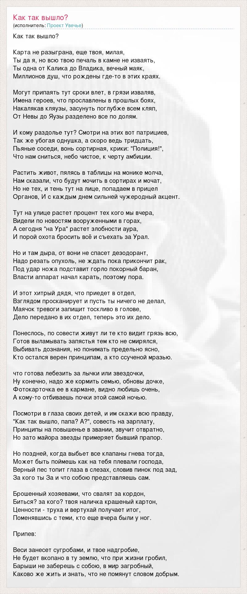 Как так вышло? Карта не разыграна, еще твоя, милая, Ты да я, но всю твою печаль в камне не изваять, Ты одна от Калика до Владика, вечный маяк, Миллионов душ, что рождены где-то в этих краях. Могут припаять тут сроки влет, в грязи изваляв, Имена героев, что прославлены в прошлых боях, Накалякав кляузы, засунуть поглубже всем кляп, От Невы до Яузы разделено все по долям. И кому раздолье тут? Смотри на этих вот патрициев, Так же убогая однушка, а скоро ведь тридцать, Пьяные соседи, вонь сортирная, крики: "Полиция!", Что нам сниться, небо чистое, к черту амбиции. Растить живот, пялясь в таблицы на монике молча, Нам сказали, что будут мочить в сортирах и мочат, Но не тех, и тень тут на лице, попадаем в прицел Органов, И с каждым днем сильней чужеродный акцент. Тут на улице растет процент тех кого мы вчера, Видели по новостям вооруженными в горах, А сегодня "на Ура" растет злобности аура, И порой охота бросить всё и съехать за Урал. Но и там дыра, от вони не спасет дезодорант, Надо резать опухоль, не ждать пока прикончит рак, Под удар ножа подставит горло покорный баран, Власти аппарат начал карать, поэтому пора. И этот хитрый дядя, что приедет в отдел, Взглядом просканирует и пусть ты ничего не делал, Маячок тревоги запищит тоскливо в голове, Дело передано в их отдел, теперь это их дело. Понеслось, по совести живут ли те кто видит грязь всю, Готов выламывать запястья тем кто не смирялся, Выбивать дознания, но понимать предельно ясно, Кто остался верен принципам, а кто ссученой мразью. что готова лебезить за лычки или звездочки, Ну конечно, надо же кормить семью, обновы дочке, Фотокарточка ее в кармане, видно любишь очень, А кому-то отбиваешь почки этой самой ночью. Посмотри в глаза своих детей, и им скажи всю правду, "Как так вышло, папа? А?", совесть на зарплату, Принципы на повышенье в звании, звучит отвратно, Но зато майора звезды примеряет бывший прапор. Но поздней, когда выбьет все клапаны гнева тогда, Может быть поймешь как на тебя плевали господа, Верный пес топит глаза в слезах, словив пинок под зад, За кого ты За и что собою представляешь сам. Брошенный хозяевами, что свалят за кордон, Биться? за кого? твоя наличка крашеный картон, Ценности - труха и вертухай получает итог, Поменявшись с теми, кто еще вчера были у ног. Припев: Веси занесет сугробами, и твое надгробие, Не будет вкопано в ту землю, что при жизни гробил, Барыши не заберешь с собою, в мир загробный, Каково же жить и знать, что не помянут словом добрым.