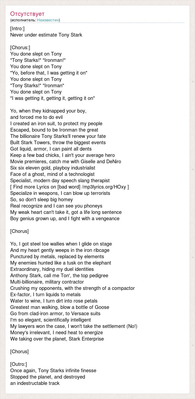 [Intro:] Never under estimate Tony Stark [Chorus:] You done slept on Tony "Tony Starks!" "Ironman!" You done slept on Tony "Yo, before that, I was getting it on" You done slept on Tony "Tony Starks!" "Ironman" You done slept on Tony "I was getting it, getting it, getting it on" Yo, when they kidnapped your boy, and forced me to do evil I created an iron suit, to protect my people Escaped, bound to be Ironman the great The billionaire Tony Starks'll renew your fate Built Stark Towers, throw the biggest events Got liquid, armor, I can paint all dents Keep a few bad chicks, I ain't your average hero Movie premieres, catch me with Giselle and DeNiro Six six eleven gold, playboy industrialist Face of a ghost, mind of a technologist Specialist, modern day speech slang therapist [ Find more Lyrics on [bad word] /mp3lyrics.org/HOxy ] Specialize in weapons, I can blow up terrorists So, so don't sleep big homey Real recognize and I can see you phoneys My weak heart can't take it, got a life long sentence Boy genius grown up, and I fight with a vengeance [Chorus] Yo, I got steel toe wallies when I glide on stage And my heart gently weeps in the iron ribcage Punctured by metals, replaced by elements My enemies hunted like a tusk on the elephant Extraordinary, hiding my duel identities Anthony Stark, call me Ton', the top pedigree Multi-billionaire, military contractor Crushing my opponents, with the strength of a compactor Ex-factor, I turn liquids to metals Water to wine, I turn dirt into rose petals Greatest man walking, blow a bottle of Goose Go from clad-iron armor, to Versace suits I'm so elegant, scientifically intelligent My lawyers won the case, I won't take the settlement (No!) Money's irrelevant, I need heat to energize We taking over the planet, Stark Enterprise [Chorus] [Outro:] Once again, Tony Starks infinite finesse Stopped the planet, and destroyed an indestructable track