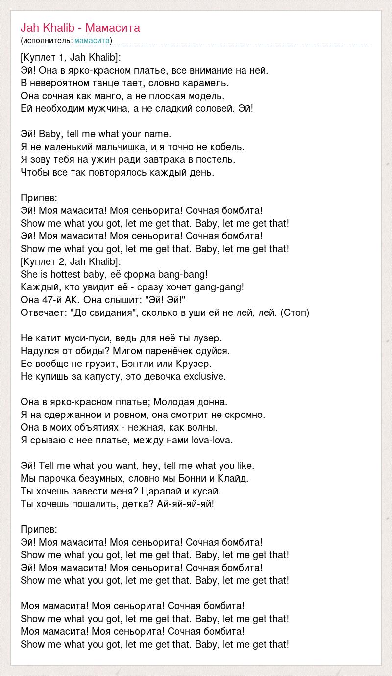[Куплет 1, Jah Khalib]: Эй! Она в ярко-красном платье, все внимание на ней. В невероятном танце тает, словно карамель. Она сочная как манго, а не плоская модель. Ей необходим мужчина, а не сладкий соловей. Эй! Эй! Baby, tell me what your name. Я не маленький мальчишка, и я точно не кобель. Я зову тебя на ужин ради завтрака в постель. Чтобы все так повторялось каждый день. Припев: Эй! Моя мамасита! Моя сеньорита! Сочная бомбита! Show me what you got, let me get that. Baby, let me get that! Эй! Моя мамасита! Моя сеньорита! Сочная бомбита! Show me what you got, let me get that. Baby, let me get that! [Куплет 2, Jah Khalib]: She is hottest baby, её форма bang-bang! Каждый, кто увидит её - сразу хочет gang-gang! Она 47-й АК. Она слышит: "Эй! Эй!" Отвечает: "До свидания", сколько в уши ей не лей, лей. (Стоп) Не катит муси-пуси, ведь для неё ты лузер. Надулся от обиды? Мигом паренёчек сдуйся. Ее вообще не грузит, Бэнтли или Крузер. Не купишь за капусту, это девочка exclusive. Она в ярко-красном платье; Молодая донна. Я на сдержанном и ровном, она смотрит не скромно. Она в моих объятиях - нежная, как волны. Я срываю с нее платье, между нами lova-lova. Эй! Tell me what you want, hey, tell me what you like. Мы парочка безумных, словно мы Бонни и Клайд. Ты хочешь завести меня? Царапай и кусай. Ты хочешь пошалить, детка? Ай-яй-яй-яй! Припев: Эй! Моя мамасита! Моя сеньорита! Сочная бомбита! Show me what you got, let me get that. Baby, let me get that! Эй! Моя мамасита! Моя сеньорита! Сочная бомбита! Show me what you got, let me get that. Baby, let me get that! Моя мамасита! Моя сеньорита! Сочная бомбита! Show me what you got, let me get that. Baby, let me get that! Моя мамасита! Моя сеньорита! Сочная бомбита! Show me what you got, let me get that. Baby, let me get that!