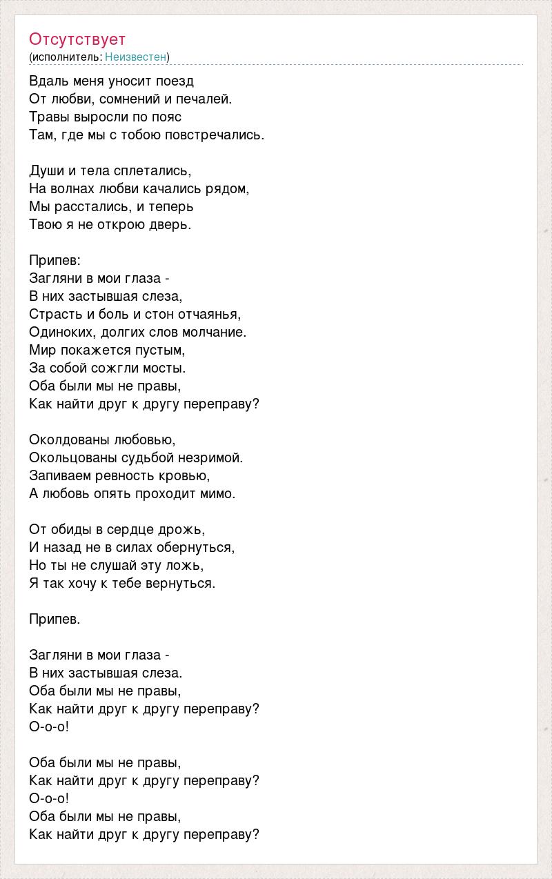 Вдаль меня уносит поезд От любви, сомнений и печалей. Травы выросли по пояс Там, где мы с тобою повстречались. Души и тела сплетались, На волнах любви качались рядом, Мы расстались, и теперь Твою я не открою дверь. Припев: Загляни в мои глаза - В них застывшая слеза, Страсть и боль и стон отчаянья, Одиноких, долгих слов молчание. Мир покажется пустым, За собой сожгли мосты. Оба были мы не правы, Как найти друг к другу переправу? Околдованы любовью, Окольцованы судьбой незримой. Запиваем ревность кровью, А любовь опять проходит мимо. От обиды в сердце дрожь, И назад не в силах обернуться, Но ты не слушай эту ложь, Я так хочу к тебе вернуться. Припев. Загляни в мои глаза - В них застывшая слеза. Оба были мы не правы, Как найти друг к другу переправу? О-о-о! Оба были мы не правы, Как найти друг к другу переправу? О-о-о! Оба были мы не правы, Как найти друг к другу переправу?