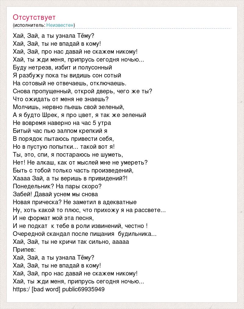 Хай, Зай, а ты узнала Тёму? Хай, Зай, ты не впадай в кому! Хай, Зай, про нас давай не скажем никому! Хай, ты жди меня, припрусь сегодня ночью... Буду нетрезв, избит и полусонный Я разбужу пока ты видишь сон сотый На сотовый не отвечаешь, отключаешь. Снова пропущенный, открой дверь, чего же ты? Что ожидать от меня не знаешь? Молчишь, нервно пьешь свой зеленый, А я будто Шрек, я про цвет, я так же зеленый Не вовремя наверно на час 5 утра Битый час пью залпом крепкий я В порядок пытаюсь привести себя, Но в пустую попытки... такой вот я! Ты, это, спи, я постараюсь не шуметь, Нет! Не алкаш, как от мыслей мне не умереть? Быть с тобой только часть произведений, Хаааа Зай, а ты веришь в привидений?! Понедельник? На пары скоро? Забей! Давай уснем мы снова Новая прическа? Не заметил в адекватные Ну, хоть какой то плюс, что прихожу я на рассвете... И не формат мой эта песня, И не подкат к тебе в роли извинений, честно ! Очередной скандал после пищания будильника... Хай, Зай, ты не кричи так сильно, ааааа Припев: Хай, Зай, а ты узнала Тёму? Хай, Зай, ты не впадай в кому! Хай, Зай, про нас давай не скажем никому! Хай, ты жди меня, припрусь сегодня ночью... https:/ [bad word] public69935949