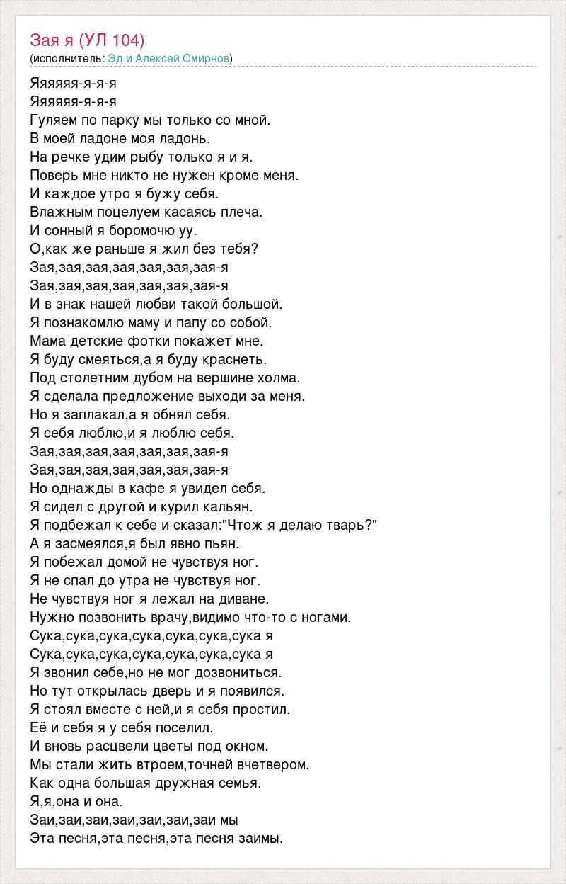 Яяяяяя-я-я-я Яяяяяя-я-я-я Гуляем по парку мы только со мной. В моей ладоне моя ладонь. На речке удим рыбу только я и я. Поверь мне никто не нужен кроме меня. И каждое утро я бужу себя. Влажным поцелуем касаясь плеча. И сонный я боромочю уу. О,как же раньше я жил без тебя? Зая,зая,зая,зая,зая,зая,зая-я Зая,зая,зая,зая,зая,зая,зая-я И в знак нашей любви такой большой. Я познакомлю маму и папу со собой. Мама детские фотки покажет мне. Я буду смеяться,а я буду краснеть. Под столетним дубом на вершине холма. Я сделала предложение выходи за меня. Но я заплакал,а я обнял себя. Я себя люблю,и я люблю себя. Зая,зая,зая,зая,зая,зая,зая-я Зая,зая,зая,зая,зая,зая,зая-я Но однажды в кафе я увидел себя. Я сидел с другой и курил кальян. Я подбежал к себе и сказал:"Чтож я делаю тварь?" А я засмеялся,я был явно пьян. Я побежал домой не чувствуя ног. Я не спал до утра не чувствуя ног. Не чувствуя ног я лежал на диване. Нужно позвонить врачу,видимо что-то с ногами. Сука,сука,сука,сука,сука,сука,сука я Сука,сука,сука,сука,сука,сука,сука я Я звонил себе,но не мог дозвониться. Но тут открылась дверь и я появился. Я стоял вместе с ней,и я себя простил. Её и себя я у себя поселил. И вновь расцвели цветы под окном. Мы стали жить втроем,точней вчетвером. Как одна большая дружная семья. Я,я,она и она. Заи,заи,заи,заи,заи,заи,заи мы Эта песня,эта песня,эта песня заимы.