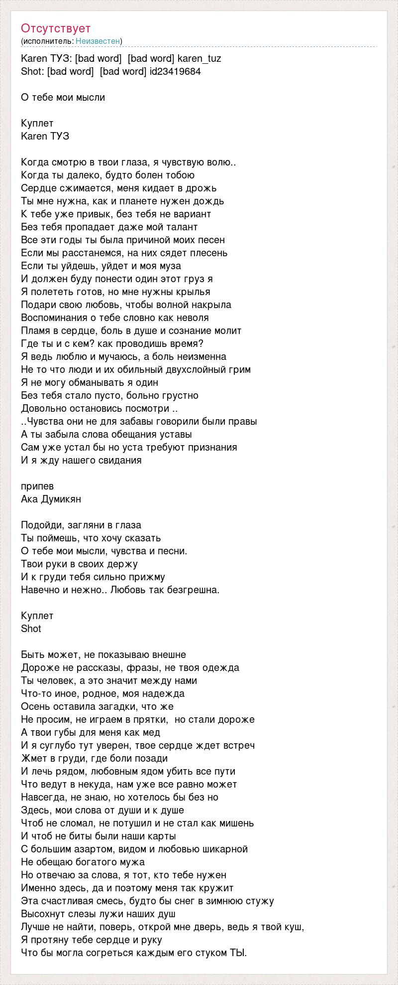 Karen ТУЗ: [bad word] [bad word] karen_tuz Shot: [bad word] [bad word] id23419684 О тебе мои мысли Куплет Karen ТУЗ Когда смотрю в твои глаза, я чувствую волю.. Когда ты далеко, будто болен тобою Сердце сжимается, меня кидает в дрожь Ты мне нужна, как и планете нужен дождь К тебе уже привык, без тебя не вариант Без тебя пропадает даже мой талант Все эти годы ты была причиной моих песен Если мы расстанемся, на них сядет плесень Если ты уйдешь, уйдет и моя муза И должен буду понести один этот груз я Я полететь готов, но мне нужны крылья Подари свою любовь, чтобы волной накрыла Воспоминания о тебе словно как неволя Пламя в сердце, боль в душе и сознание молит Где ты и с кем? как проводишь время? Я ведь люблю и мучаюсь, а боль неизменна Не то что люди и их обильный двухслойный грим Я не могу обманывать я один Без тебя стало пусто, больно грустно Довольно остановись посмотри .. ..Чувства они не для забавы говорили были правы А ты забыла слова обещания уставы Сам уже устал бы но уста требуют признания И я жду нашего свидания припев Ака Думикян Подойди, загляни в глаза Ты поймешь, что хочу сказать О тебе мои мысли, чувства и песни. Твои руки в своих держу И к груди тебя сильно прижму Навечно и нежно.. Любовь так безгрешна. Куплет Shot Быть может, не показываю внешне Дороже не рассказы, фразы, не твоя одежда Ты человек, а это значит между нами Что-то иное, родное, моя надежда Осень оставила загадки, что же Не просим, не играем в прятки, но стали дороже А твои губы для меня как мед И я суглубо тут уверен, твое сердце ждет встреч Жмет в груди, где боли позади И лечь рядом, любовным ядом убить все пути Что ведут в некуда, нам уже все равно может Навсегда, не знаю, но хотелось бы без но Здесь, мои слова от души и к душе Чтоб не сломал, не потушил и не стал как мишень И чтоб не биты были наши карты С большим азартом, видом и любовью шикарной Не обещаю богатого мужа Но отвечаю за слова, я тот, кто тебе нужен Именно здесь, да и поэтому меня так кружит Эта счастливая смесь, будто бы снег в зимнюю стужу Высохнут слезы лужи наших душ Лучше не найти, поверь, открой мне дверь, ведь я твой куш, Я протяну тебе сердце и руку Что бы могла согреться каждым его стуком ТЫ.