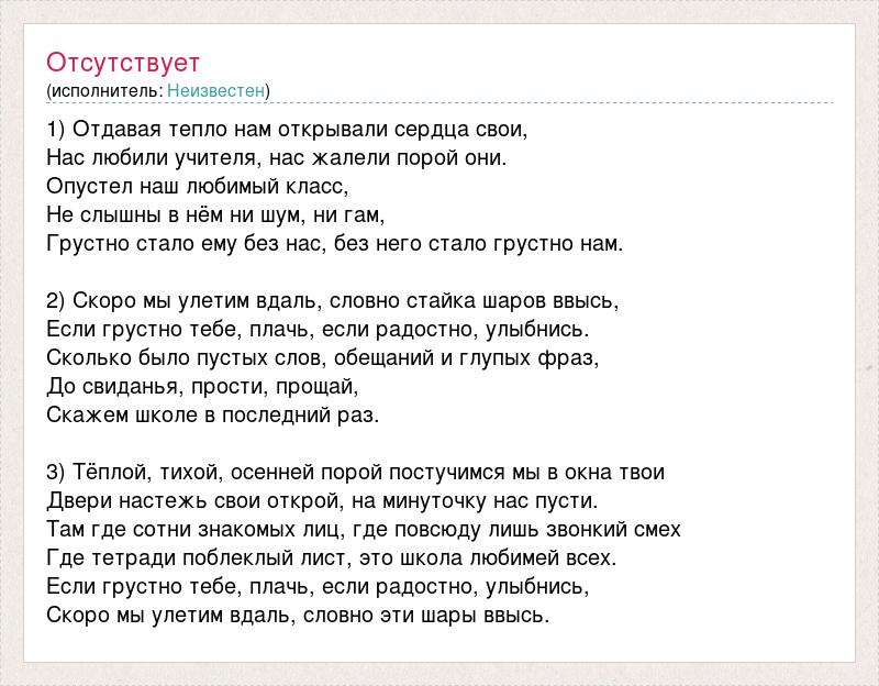 1) Отдавая тепло нам открывали сердца свои, Нас любили учителя, нас жалели порой они. Опустел наш любимый класс, Не слышны в нём ни шум, ни гам, Грустно стало ему без нас, без него стало грустно нам. 2) Скоро мы улетим вдаль, словно стайка шаров ввысь, Если грустно тебе, плачь, если радостно, улыбнись. Сколько было пустых слов, обещаний и глупых фраз, До свиданья, прости, прощай, Скажем школе в последний раз. 3) Тёплой, тихой, осенней порой постучимся мы в окна твои Двери настежь свои открой, на минуточку нас пусти. Там где сотни знакомых лиц, где повсюду лишь звонкий смех Где тетради поблеклый лист, это школа любимей всех. Если грустно тебе, плачь, если радостно, улыбнись, Скоро мы улетим вдаль, словно эти шары ввысь.