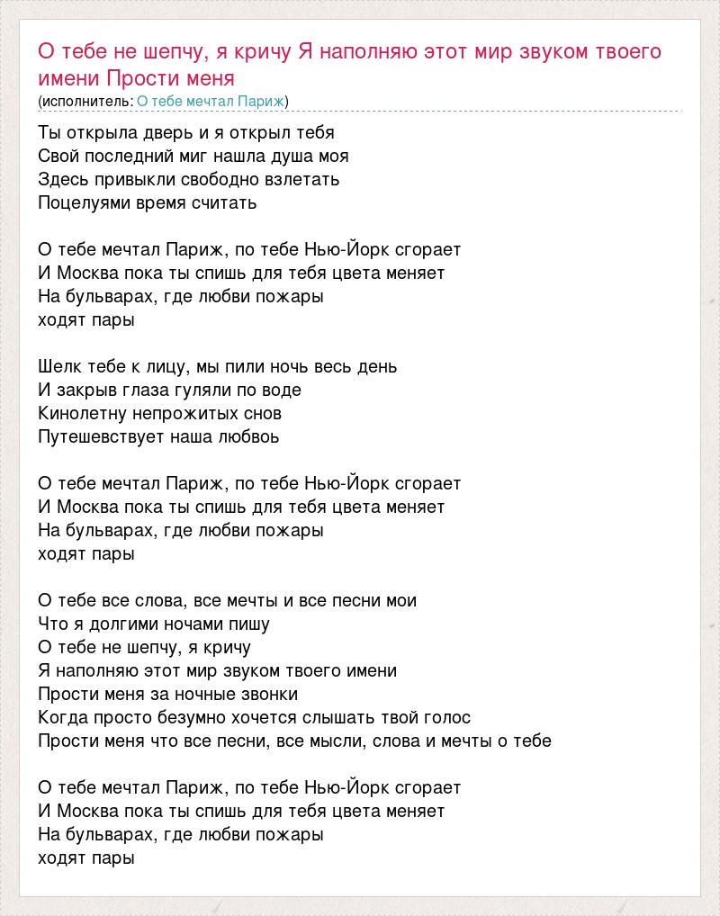 Ты открыла дверь и я открыл тебя Свой последний миг нашла душа моя Здесь привыкли свободно взлетать Поцелуями время считать О тебе мечтал Париж, по тебе Нью-Йорк сгорает И Москва пока ты спишь для тебя цвета меняет На бульварах, где любви пожары ходят пары Шелк тебе к лицу, мы пили ночь весь день И закрыв глаза гуляли по воде Кинолетну непрожитых снов Путешевствует наша любвоь О тебе мечтал Париж, по тебе Нью-Йорк сгорает И Москва пока ты спишь для тебя цвета меняет На бульварах, где любви пожары ходят пары О тебе все слова, все мечты и все песни мои Что я долгими ночами пишу О тебе не шепчу, я кричу Я наполняю этот мир звуком твоего имени Прости меня за ночные звонки Когда просто безумно хочется слышать твой голос Прости меня что все песни, все мысли, слова и мечты о тебе О тебе мечтал Париж, по тебе Нью-Йорк сгорает И Москва пока ты спишь для тебя цвета меняет На бульварах, где любви пожары ходят пары