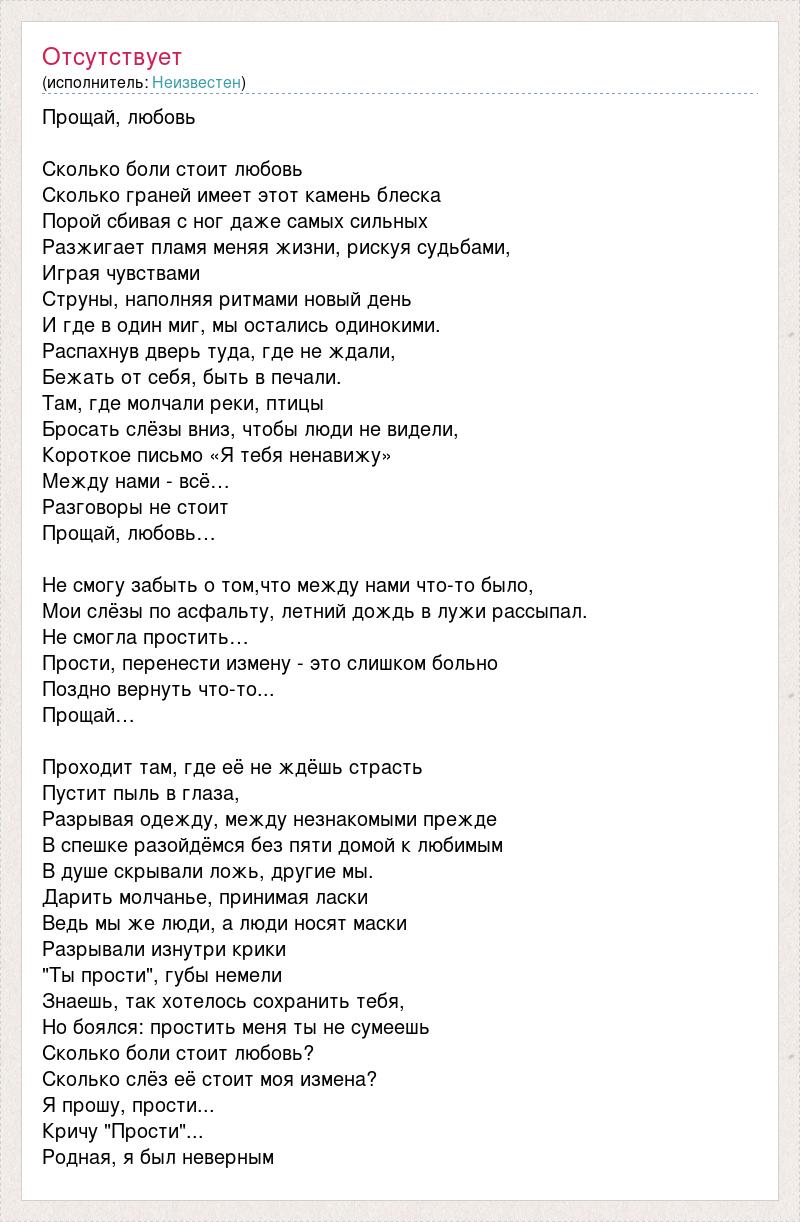 Прощай, любовь Сколько боли стоит любовь Сколько граней имеет этот камень блеска Порой сбивая с ног даже самых сильных Разжигает пламя меняя жизни, рискуя судьбами, Играя чувствами Струны, наполняя ритмами новый день И где в один миг, мы остались одинокими. Распахнув дверь туда, где не ждали, Бежать от себя, быть в печали. Там, где молчали реки, птицы Бросать слёзы вниз, чтобы люди не видели, Короткое письмо «Я тебя ненавижу» Между нами - всё… Разговоры не стоит Прощай, любовь… Не смогу забыть о том,что между нами что-то было, Мои слёзы по асфальту, летний дождь в лужи рассыпал. Не смогла простить… Прости, перенести измену - это слишком больно Поздно вернуть что-то... Прощай… Проходит там, где её не ждёшь страсть Пустит пыль в глаза, Разрывая одежду, между незнакомыми прежде В спешке разойдёмся без пяти домой к любимым В душе скрывали ложь, другие мы. Дарить молчанье, принимая ласки Ведь мы же люди, а люди носят маски Разрывали изнутри крики "Ты прости", губы немели Знаешь, так хотелось сохранить тебя, Но боялся: простить меня ты не сумеешь Сколько боли стоит любовь? Сколько слёз её стоит моя измена? Я прошу, прости... Кричу "Прости"... Родная, я был неверным