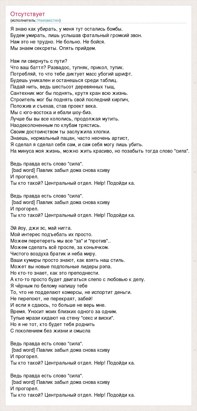 Я знаю как убирать, у меня тут остались бомбы. Будем умирать, лишь услышав фатальный громкий звон. Нам это не трудно. Не больно. Не бойся. Мы знаем сексреты. Опять прийдем. Нам ли свернуть с пути? Что ваш баттл? Развадос, тупняк, прикол, тупик. Потребляй, то что тебе диктует масс убогий шрифт. Будешь уникален и останешься среди таблиц. Падай нить, ведь шестьсот деревянных тыщ, Сантехник мог бы поднять, крутя кран всю жизнь. Строитель мог бы поднять свой последний кирпич, Положив и съехав, став проект века. Мы с юго-востока и ебали шоу-биз. Лучше бы вы все кололись, продолжая мутить. Наодеколоненным по клубам трястись. Своим достоинством ты заслужила хлопки. Знаешь, нормальный пацан, часто неочень артист, Я сделал я сделал себя сам, и сам себя могу лишь убить. На минуса моя жизнь, можно жить красиво, но позабыть тогда слово "сила". Ведь правда есть слово "сила". [bad word] Павлик забыл дома снова ксиву И прогорел. Ты кто такой? Центральный отдел. Help! Подойди ка. Ведь правда есть слово "сила". [bad word] Павлик забыл дома снова ксиву И прогорел. Ты кто такой? Центральный отдел. Help! Подойди ка. Эй йоу, джи эс, май нигга. Мой интерес подъебать их просто. Можем перетереть мы все "за" и "против".. Можем сделать всё просле, за коньячком. Чистого воздуха братик и неба миру. Ваши кумиры просто знают, как взять наш стиль. Может вы новые подпольные лидеры рэпа. Но кто-то знает, как это преподнести. А кто-то просто будет двигаться слепо с любовью к делу. Я чёрным по белому напишу тебе То, что не подделают комерсы, не испортит деньги. Не перепоют, не перекраят, забей! И если я сдаюсь, то больше не верь мне. Время. Уносит моих близких одного за одним. Тупые мрази кидают на стену "секс и виски". Но я не тот, кто будет тебя роднить С поколением без жизни и смысла Ведь правда есть слово "сила". [bad word] Павлик забыл дома снова ксиву И прогорел. Ты кто такой? Центральный отдел. Help! Подойди ка. Ведь правда есть слово "сила". [bad word] Павлик забыл дома снова ксиву И прогорел. Ты кто такой? Центральный отдел. Help! Подойди ка.