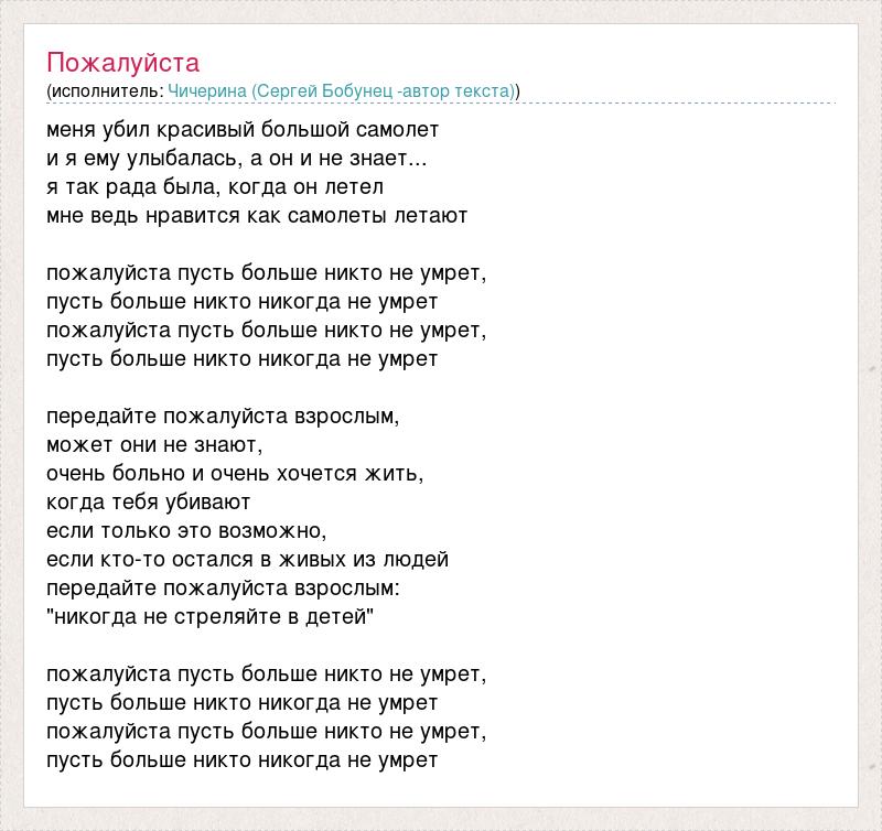 меня убил красивый большой самолет и я ему улыбалась, а он и не знает... я так рада была, когда он летел мне ведь нравится как самолеты летают пожалуйста пусть больше никто не умрет, пусть больше никто никогда не умрет пожалуйста пусть больше никто не умрет, пусть больше никто никогда не умрет передайте пожалуйста взрослым, может они не знают, очень больно и очень хочется жить, когда тебя убивают если только это возможно, если кто-то остался в живых из людей передайте пожалуйста взрослым: "никогда не стреляйте в детей" пожалуйста пусть больше никто не умрет, пусть больше никто никогда не умрет пожалуйста пусть больше никто не умрет, пусть больше никто никогда не умрет