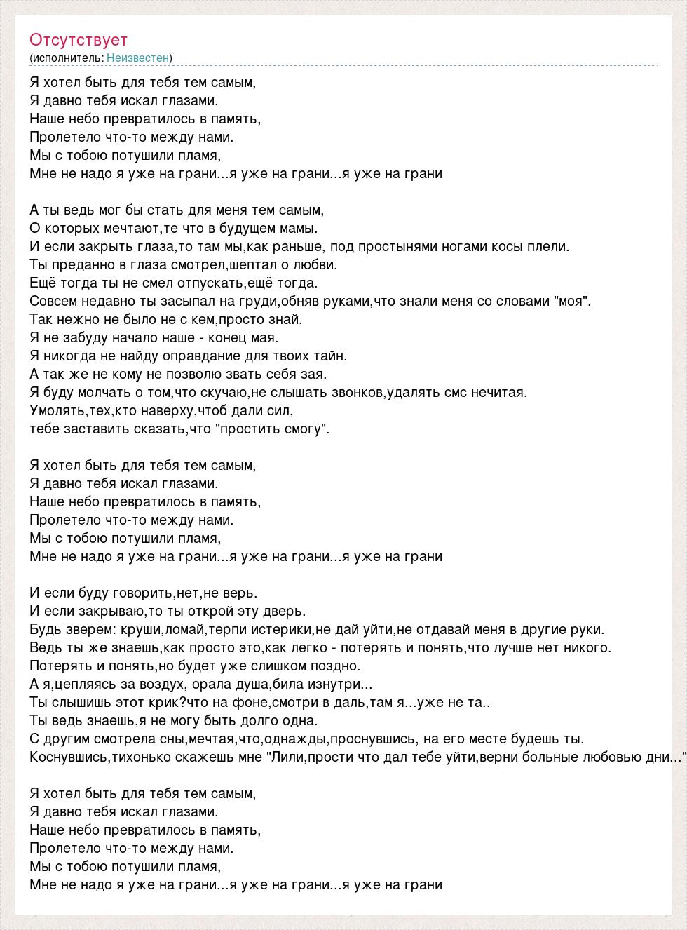Я хотел быть для тебя тем самым, Я давно тебя искал глазами. Наше небо превратилось в память, Пролетело что-то между нами. Мы с тобою потушили пламя, Мне не надо я уже на грани...я уже на грани...я уже на грани А ты ведь мог бы стать для меня тем самым, О которых мечтают,те что в будущем мамы. И если закрыть глаза,то там мы,как раньше, под простынями ногами косы плели. Ты преданно в глаза смотрел,шептал о любви. Ещё тогда ты не смел отпускать,ещё тогда. Совсем недавно ты засыпал на груди,обняв руками,что знали меня со словами "моя". Так нежно не было не с кем,просто знай. Я не забуду начало наше - конец мая. Я никогда не найду оправдание для твоих тайн. А так же не кому не позволю звать себя зая. Я буду молчать о том,что скучаю,не слышать звонков,удалять смс нечитая. Умолять,тех,кто наверху,чтоб дали сил, тебе заставить сказать,что "простить смогу". Я хотел быть для тебя тем самым, Я давно тебя искал глазами. Наше небо превратилось в память, Пролетело что-то между нами. Мы с тобою потушили пламя, Мне не надо я уже на грани...я уже на грани...я уже на грани И если буду говорить,нет,не верь. И если закрываю,то ты открой эту дверь. Будь зверем: круши,ломай,терпи истерики,не дай уйти,не отдавай меня в другие руки. Ведь ты же знаешь,как просто это,как легко - потерять и понять,что лучше нет никого. Потерять и понять,но будет уже слишком поздно. А я,цепляясь за воздух, орала душа,била изнутри... Ты слышишь этот крик?что на фоне,смотри в даль,там я...уже не та.. Ты ведь знаешь,я не могу быть долго одна. С другим смотрела сны,мечтая,что,однажды,проснувшись, на его месте будешь ты. Коснувшись,тихонько скажешь мне "Лили,прости что дал тебе уйти,верни больные любовью дни..." Я хотел быть для тебя тем самым, Я давно тебя искал глазами. Наше небо превратилось в память, Пролетело что-то между нами. Мы с тобою потушили пламя, Мне не надо я уже на грани...я уже на грани...я уже на грани