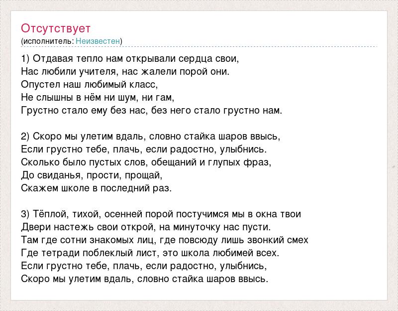 1) Отдавая тепло нам открывали сердца свои, Нас любили учителя, нас жалели порой они. Опустел наш любимый класс, Не слышны в нём ни шум, ни гам, Грустно стало ему без нас, без него стало грустно нам. 2) Скоро мы улетим вдаль, словно стайка шаров ввысь, Если грустно тебе, плачь, если радостно, улыбнись. Сколько было пустых слов, обещаний и глупых фраз, До свиданья, прости, прощай, Скажем школе в последний раз. 3) Тёплой, тихой, осенней порой постучимся мы в окна твои Двери настежь свои открой, на минуточку нас пусти. Там где сотни знакомых лиц, где повсюду лишь звонкий смех Где тетради поблеклый лист, это школа любимей всех. Если грустно тебе, плачь, если радостно, улыбнись, Скоро мы улетим вдаль, словно стайка шаров ввысь.
