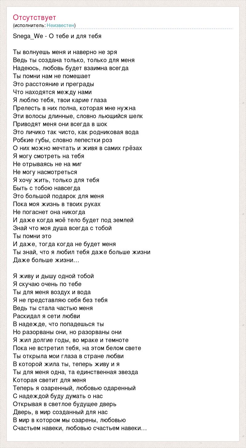 Snega_We - О тебе и для тебя Ты волнуешь меня и наверно не зря Ведь ты создана только, только для меня Надеюсь, любовь будет взаимна всегда Ты помни нам не помешает Это расстояние и преграды Что находятся между нами Я люблю тебя, твои карие глаза Прелесть в них полна, которая мне нужна Эти волосы длинные, словно льющийся шелк Приводят меня они всегда в шок Это личико так чисто, как родниковая вода Робкие губы, словно лепестки роз О них можно мечтать и живя в самих грёзах Я могу смотреть на тебя Не отрываясь не на миг Не могу насмотреться Я хочу жить, только для тебя Быть с тобою навсегда Это большой подарок для меня Пока моя жизнь в твоих руках Не погаснет она никогда И даже когда моё тело будет под землей Знай что моя душа всегда с тобой Ты помни это И даже, тогда когда не будет меня Ты знай, что я любил тебя даже больше жизни Даже больше жизни… Я живу и дышу одной тобой Я скучаю очень по тебе Ты для меня воздух и вода Я не представляю себя без тебя Ведь ты стала частью меня Раскидал я сети любви В надежде, что попадешься ты Но разорваны они, но разорваны они Я жил долгие годы, во мраке и темноте Пока не встретил тебя, на этом белом свете Ты открыла мои глаза в стране любви В которой жила ты, теперь живу и я Ты для меня одна, та единственная звезда Которая светит для меня Теперь я озаренный, любовью одаренный С надеждой буду думать о нас Открывая в светлое будущее дверь Дверь, в мир созданный для нас В мир в котором мы озарены, любовью Счастьем навеки, любовью счастьем навеки…