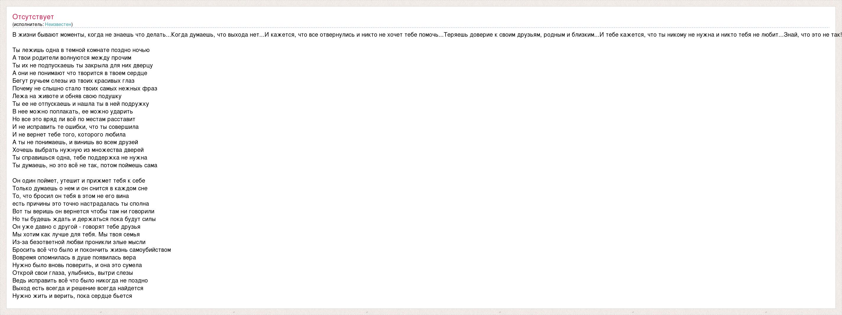 В жизни бывают моменты, когда не знаешь что делать...Когда думаешь, что выхода нет...И кажется, что все отвернулись и никто не хочет тебе помочь...Теряешь доверие к своим друзьям, родным и близким...И тебе кажется, что ты никому не нужна и никто тебя не любит...Знай, что это не так! Ты лежишь одна в темной комнате поздно ночью А твои родители волнуются между прочим Ты их не подпускаешь ты закрыла для них дверцу А они не понимают что творится в твоем сердце Бегут ручьем слезы из твоих красивых глаз Почему не слышно стало твоих самых нежных фраз Лежа на животе и обняв свою подушку Ты ее не отпускаешь и нашла ты в ней подружку В нее можно поплакать, ее можно ударить Но все это вряд ли всё по местам расставит И не исправить те ошибки, что ты совершила И не вернет тебе того, которого любила А ты не понимаешь, и винишь во всем друзей Хочешь выбрать нужную из множества дверей Ты справишься одна, тебе поддержка не нужна Ты думаешь, но это всё не так, потом поймешь сама Он один поймет, утешит и прижмет тебя к себе Только думаешь о нем и он снится в каждом сне То, что бросил он тебя в этом не его вина есть причины это точно настрадалась ты сполна Вот ты веришь он вернется чтобы там ни говорили Но ты будешь ждать и держаться пока будут силы Он уже давно с другой - говорят тебе друзья Мы хотим как лучше для тебя. Мы твоя семья Из-за безответной любви проникли злые мысли Бросить всё что было и покончить жизнь самоубийством Вовремя опомнилась в душе появилась вера Нужно было вновь поверить, и она это сумела Открой свои глаза, улыбнись, вытри слезы Ведь исправить всё что было никогда не поздно Выход есть всегда и решение всегда найдется Нужно жить и верить, пока сердце бьется