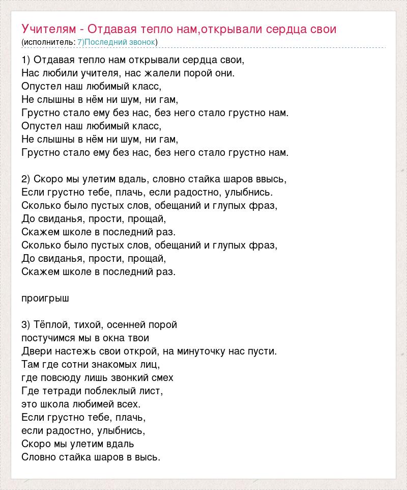 1) Отдавая тепло нам открывали сердца свои, Нас любили учителя, нас жалели порой они. Опустел наш любимый класс, Не слышны в нём ни шум, ни гам, Грустно стало ему без нас, без него стало грустно нам. Опустел наш любимый класс, Не слышны в нём ни шум, ни гам, Грустно стало ему без нас, без него стало грустно нам. 2) Скоро мы улетим вдаль, словно стайка шаров ввысь, Если грустно тебе, плачь, если радостно, улыбнись. Сколько было пустых слов, обещаний и глупых фраз, До свиданья, прости, прощай, Скажем школе в последний раз. Сколько было пустых слов, обещаний и глупых фраз, До свиданья, прости, прощай, Скажем школе в последний раз. проигрыш 3) Тёплой, тихой, осенней порой постучимся мы в окна твои Двери настежь свои открой, на минуточку нас пусти. Там где сотни знакомых лиц, где повсюду лишь звонкий смех Где тетради поблеклый лист, это школа любимей всех. Если грустно тебе, плачь, если радостно, улыбнись, Скоро мы улетим вдаль Словно стайка шаров в высь.