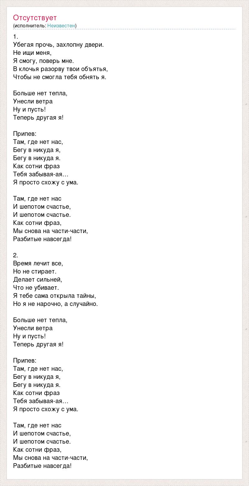 1. Убегая прочь, захлопну двери. Не ищи меня, Я смогу, поверь мне. В клочья разорву твои объятья, Чтобы не смогла тебя обнять я. Больше нет тепла, Унесли ветра Ну и пусть! Теперь другая я! Припев: Там, где нет нас, Бегу в никуда я, Бегу в никуда я. Как сотни фраз Тебя забывая-ая… Я просто схожу с ума. Там, где нет нас И шепотом счастье, И шепотом счастье. Как сотни фраз, Мы снова на части-части, Разбитые навсегда! 2. Время лечит все, Но не стирает. Делает сильней, Что не убивает. Я тебе сама открыла тайны, Но я не нарочно, а случайно. Больше нет тепла, Унесли ветра Ну и пусть! Теперь другая я! Припев: Там, где нет нас, Бегу в никуда я, Бегу в никуда я. Как сотни фраз Тебя забывая-ая… Я просто схожу с ума. Там, где нет нас И шепотом счастье, И шепотом счастье. Как сотни фраз, Мы снова на части-части, Разбитые навсегда!