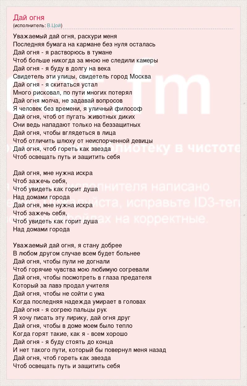 Уважаемый дай огня, раскури меня Последняя бумага на кармане без нуля осталась Дай огня - я растворюсь в тумане Чтоб больше никогда за мною не следили камеры Дай огня - я буду в долгу на века Свидетель эти улицы, свидетель город Москва Дай огня - я скитаться устал Много рисковал, по пути многих потерял Дай огня молча, не задавай вопросов Я человек без времени, я уличный философ Дай огня, чтоб от пугать животных диких Они ведь нападают только на беззащитных Дай огня, чтобы вглядеться в лица Чтоб отличить шлюху от неиспорченной девицы Дай огня, чтоб гореть как звезда Чтоб освещать путь и защитить себя Дай огня, мне нужна искра Чтоб зажечь себя, Чтоб увидеть как горит душа Над домами города Дай огня, мне нужна искра Чтоб зажечь себя, Чтоб увидеть как горит душа Над домами города Уважаемый дай огня, я стану добрее В любом другом случае всем будет больнее Дай огня, чтобы пули не догнали Чтоб горячие чувства мою любимую согревали Дай огня, чтобы посмотреть в глаза предателя Который за лавэ продал учителя Дай огня, чтобы не сойти с ума Когда последняя надежда умирает в головах Дай огня - я согрею пальцы рук Я хочу писать эту лирику, дай огня друг Дай огня, чтобы в доме моем было тепло Когда горят такие, как я - всем хорошо Дай огня - я буду стоять до конца И нет такого пути, который бы повернул меня назад Дай огня, чтоб гореть как звезда Чтоб освещать путь и защитить себя