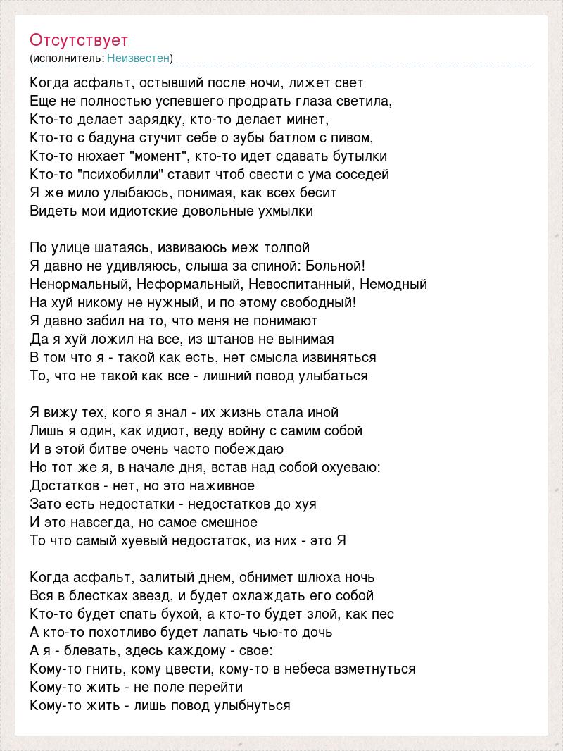 Когда асфальт, остывший после ночи, лижет свет Еще не полностью успевшего продрать глаза светила, Кто-то делает зарядку, кто-то делает минет, Кто-то с бадуна стучит себе о зубы батлом с пивом, Кто-то нюхает "момент", кто-то идет сдавать бутылки Кто-то "психобилли" ставит чтоб свести с ума соседей Я же мило улыбаюсь, понимая, как всех бесит Видеть мои идиотские довольные ухмылки По улице шатаясь, извиваюсь меж толпой Я давно не удивляюсь, слыша за спиной: Больной! Ненормальный, Неформальный, Невоспитанный, Немодный На хуй никому не нужный, и по этому свободный! Я давно забил на то, что меня не понимают Да я хуй ложил на все, из штанов не вынимая В том что я - такой как есть, нет смысла извиняться То, что не такой как все - лишний повод улыбаться Я вижу тех, кого я знал - их жизнь стала иной Лишь я один, как идиот, веду войну с самим собой И в этой битве очень часто побеждаю Но тот же я, в начале дня, встав над собой охуеваю: Достатков - нет, но это наживное Зато есть недостатки - недостатков до хуя И это навсегда, но самое смешное То что самый хуевый недостаток, из них - это Я Когда асфальт, залитый днем, обнимет шлюха ночь Вся в блестках звезд, и будет охлаждать его собой Кто-то будет спать бухой, а кто-то будет злой, как пес А кто-то похотливо будет лапать чью-то дочь А я - блевать, здесь каждому - свое: Кому-то гнить, кому цвести, кому-то в небеса взметнуться Кому-то жить - не поле перейти Кому-то жить - лишь повод улыбнуться