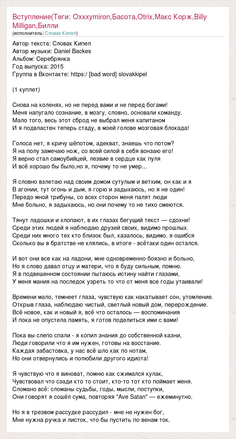 Автор текста: Словак Кипел Автор музыки: Daniel Backes Альбом: Серебрянка Год выпуска: 2015 Группа в Вконтакте: https:/ [bad word] slovakkipel (1 куплет) Снова на коленях, но не перед вами и не перед богами! Меня напугало сознание, в мозгу, словно, основали команду. Мало того, весь этот сброд не выбрал меня капитаном И я подвластен теперь стаду, в моей голове мозговая блокада! Голоса нет, я кричу шёпотом, адекват, знаешь что потом? Я на полу замечаю нож, со всей силой в себя вонзаю его! Я верно стал самоубийцей, лезвие в сердце как пуля И всё хорошо бы было,но я, почему то не умер... Я словно взлетаю над своим домом сутулым и ветхим, он как и я В агонии, тут огонь и дым, я горю и задыхаюсь, но я не один! Передо мной трибуны, со всех сторон меня палят люди Мне больно, я задыхаюсь, но они почему то не тихо смеются. Тянут ладошки и хлопают, в их глазах бегущий текст — сдохни! Среди этих людей я наблюдаю друзей своих, видимо прошлых. Среди них много тех кто близок был, казалось, видимо, я ошибся Сколько вы в братстве не клялись, в итоге - всётаки один остался. И вот они все как на ладони, мне одновременно боязно и больно, Но я слово давал отцу и матери, что я буду сильным, помню. Я в подвешенном состоянии пытаюсь истину найти глазами, У меня мания на последок узреть то что от меня все годы утаивали! Времени мало, темнеет глаза, чувствую как накатывает сон, утомление. Открыв глаза, наблюдаю чистый, светлый новый дом, перерождение. Всё новое, как и новый я, всё что осталось — воспоминания И пока не опустела память, я готов поделиться ими с вами! Пока вы слепо спали - я копил знания до собственной казни, Люди говорили что я им нужен, готовы на восстание. Каждая забастовка, у нас всё шло как по нотам, Но они отвернулись и полюбили другого идиота! Я чувствую что я виноват, помню как сжимался кулак, Чувствовал что сзади кто то стоит, кто-то тот кто поймает меня. Сломано всё: сломаны судьбы, годы, мысли, поступки, Они говорят я сошёл сума, повторяя "Ave Satan" — ежеминутно. Но я в трезвом рассудке рассудил - мне не нужен бог, Мне нужна ручка и листок, что бы пустить по венам ток.