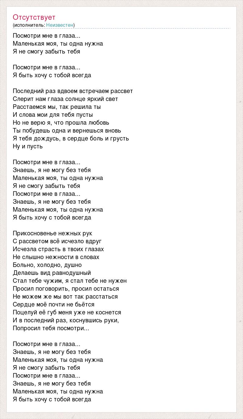 Посмотри мне в глаза... Маленькая моя, ты одна нужна Я не смогу забыть тебя Посмотри мне в глаза... Я быть хочу с тобой всегда Последний раз вдвоем встречаем рассвет Слерит нам глаза солнце яркий свет Расстаемся мы, так решила ты И слова мои для тебя пусты Но не верю я, что прошла любовь Ты побудешь одна и вернешься вновь Я тебя дождусь, в сердце боль и грусть Ну и пусть Посмотри мне в глаза... Знаешь, я не могу без тебя Маленькая моя, ты одна нужна Я не смогу забыть тебя Посмотри мне в глаза... Знаешь, я не могу без тебя Маленькая моя, ты одна нужна Я быть хочу с тобой всегда Прикосновенье нежных рук С рассветом всё исчезло вдруг Исчезла страсть в твоих глазах Не слышно нежности в словах Больно, холодно, душно Делаешь вид равнодушный Стал тебе чужим, я стал тебе не нужен Просил поговорить, просил остаться Не можем же мы вот так расстаться Сердце моё почти не бьётся Поцелуй её губ меня уже не коснется И в последний раз, коснувшись руки, Попросил тебя посмотри... Посмотри мне в глаза... Знаешь, я не могу без тебя Маленькая моя, ты одна нужна Я не смогу забыть тебя Посмотри мне в глаза... Знаешь, я не могу без тебя Маленькая моя, ты одна нужна Я быть хочу с тобой всегда