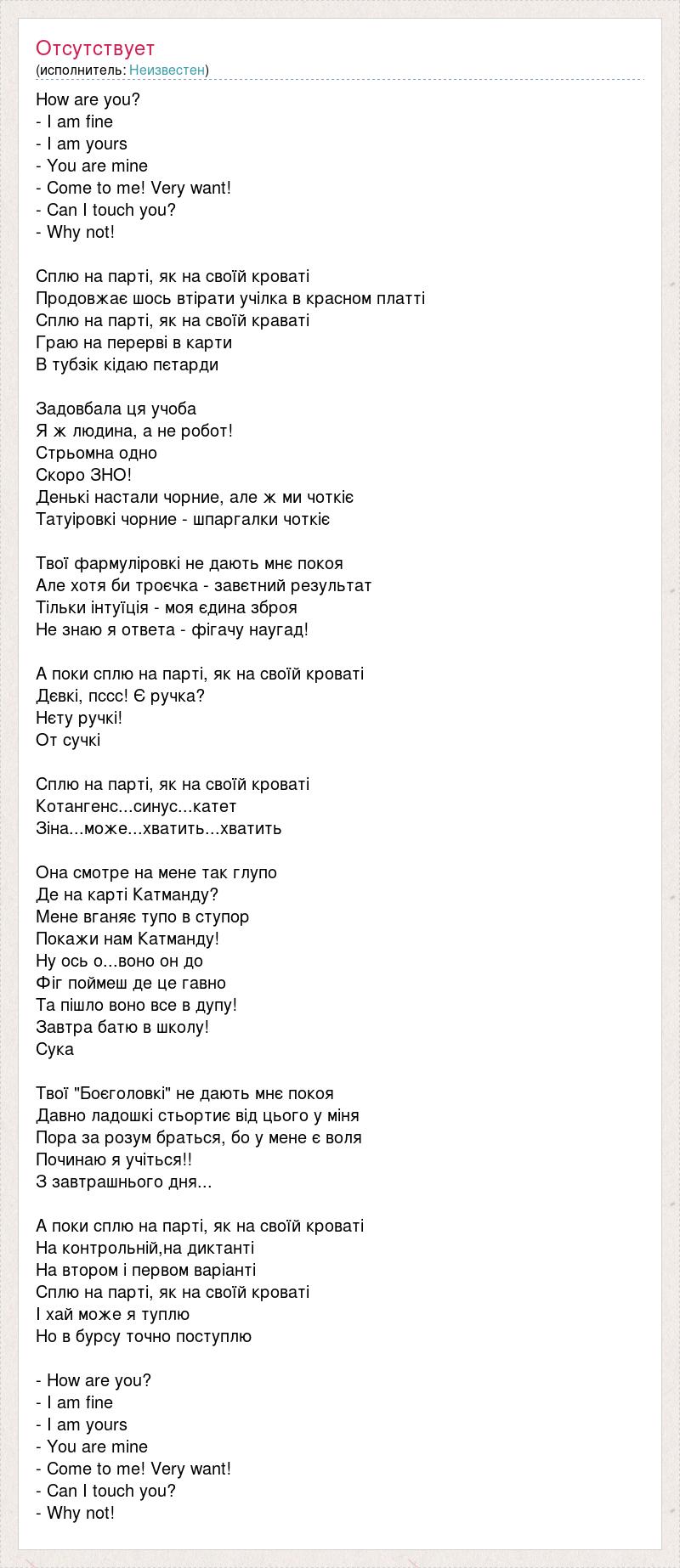 How are you? - I am fine - I am yours - You are mine - Come to me! Very want! - Can I touch you? - Why not! Сплю на парті, як на своїй кроваті Продовжає шось втірати учілка в красном платті Сплю на парті, як на своїй краваті Граю на перерві в карти В тубзік кідаю пєтарди Задовбала ця учоба Я ж людина, а не робот! Стрьомна одно Скоро ЗНО! Денькі настали чорние, але ж ми чоткіє Татуіровкі чорние - шпаргалки чоткіє Твої фармуліровкі не дають мнє покоя Але хотя би троєчка - завєтний результат Тільки інтуїція - моя єдина зброя Не знаю я ответа - фігачу наугад! А поки сплю на парті, як на своїй кроваті Дєвкі, пссс! Є ручка? Нєту ручкі! От сучкі Сплю на парті, як на своїй кроваті Котангенс...синус...катет Зіна...може...хватить...хватить Она смотре на мене так глупо Де на карті Катманду? Мене вганяє тупо в ступор Покажи нам Катманду! Ну ось о...воно он до Фіг поймеш де це гавно Та пішло воно все в дупу! Завтра батю в школу! Сука Твої "Боєголовкі" не дають мнє покоя Давно ладошкі стьортиє від цього у міня Пора за розум браться, бо у мене є воля Починаю я учіться!! З завтрашнього дня... А поки сплю на парті, як на своїй кроваті На контрольній,на диктанті На втором і первом варіанті Сплю на парті, як на своїй кроваті І хай може я туплю Но в бурсу точно поступлю - How are you? - I am fine - I am yours - You are mine - Come to me! Very want! - Can I touch you? - Why not!