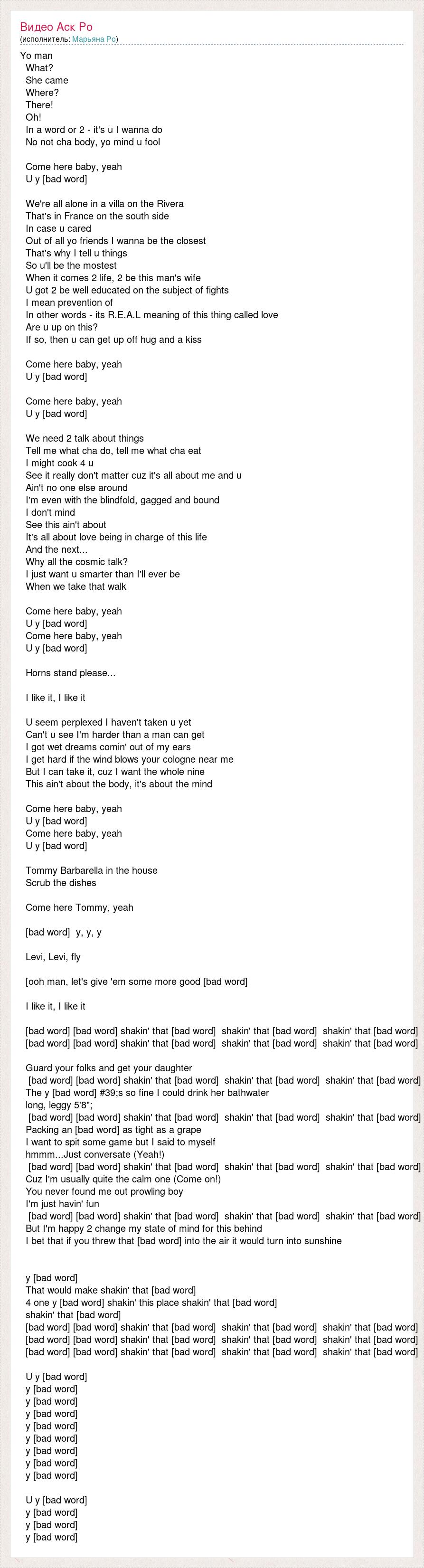 Yo man What? She came Where? There! Oh! In a word or 2 - it's u I wanna do No not cha body, yo mind u fool Come here baby, yeah U y [bad word] We're all alone in a villa on the Rivera That's in France on the south side In case u cared Out of all yo friends I wanna be the closest That's why I tell u things So u'll be the mostest When it comes 2 life, 2 be this man's wife U got 2 be well educated on the subject of fights I mean prevention of In other words - its R.E.A.L meaning of this thing called love Are u up on this? If so, then u can get up off hug and a kiss Come here baby, yeah U y [bad word] Come here baby, yeah U y [bad word] We need 2 talk about things Tell me what cha do, tell me what cha eat I might cook 4 u See it really don't matter cuz it's all about me and u Ain't no one else around I'm even with the blindfold, gagged and bound I don't mind See this ain't about It's all about love being in charge of this life And the next... Why all the cosmic talk? I just want u smarter than I'll ever be When we take that walk Come here baby, yeah U y [bad word] Come here baby, yeah U y [bad word] Horns stand please... I like it, I like it U seem perplexed I haven't taken u yet Can't u see I'm harder than a man can get I got wet dreams comin' out of my ears I get hard if the wind blows your cologne near me But I can take it, cuz I want the whole nine This ain't about the body, it's about the mind Come here baby, yeah U y [bad word] Come here baby, yeah U y [bad word] Tommy Barbarella in the house Scrub the dishes Come here Tommy, yeah [bad word] y, y, y Levi, Levi, fly [ooh man, let's give 'em some more good [bad word] I like it, I like it [bad word] [bad word] shakin' that [bad word] shakin' that [bad word] shakin' that [bad word] [bad word] [bad word] shakin' that [bad word] shakin' that [bad word] shakin' that [bad word] Guard your folks and get your daughter [bad word] [bad word] shakin' that [bad word] shakin' that [bad word] shakin' that [bad word] The y [bad word] #39;s so fine I could drink her bathwater long, leggy 5'8"; [bad word] [bad word] shakin' that [bad word] shakin' that [bad word] shakin' that [bad word] Packing an [bad word] as tight as a grape I want to spit some game but I said to myself hmmm...Just conversate (Yeah!) [bad word] [bad word] shakin' that [bad word] shakin' that [bad word] shakin' that [bad word] Cuz I'm usually quite the calm one (Come on!) You never found me out prowling boy I'm just havin' fun [bad word] [bad word] shakin' that [bad word] shakin' that [bad word] shakin' that [bad word] But I'm happy 2 change my state of mind for this behind I bet that if you threw that [bad word] into the air it would turn into sunshine y [bad word] That would make shakin' that [bad word] 4 one y [bad word] shakin' this place shakin' that [bad word] shakin' that [bad word] [bad word] [bad word] shakin' that [bad word] shakin' that [bad word] shakin' that [bad word] [bad word] [bad word] shakin' that [bad word] shakin' that [bad word] shakin' that [bad word] [bad word] [bad word] shakin' that [bad word] shakin' that [bad word] shakin' that [bad word] U y [bad word] y [bad word] y [bad word] y [bad word] y [bad word] y [bad word] y [bad word] y [bad word] y [bad word] U y [bad word] y [bad word] y [bad word] y [bad word]