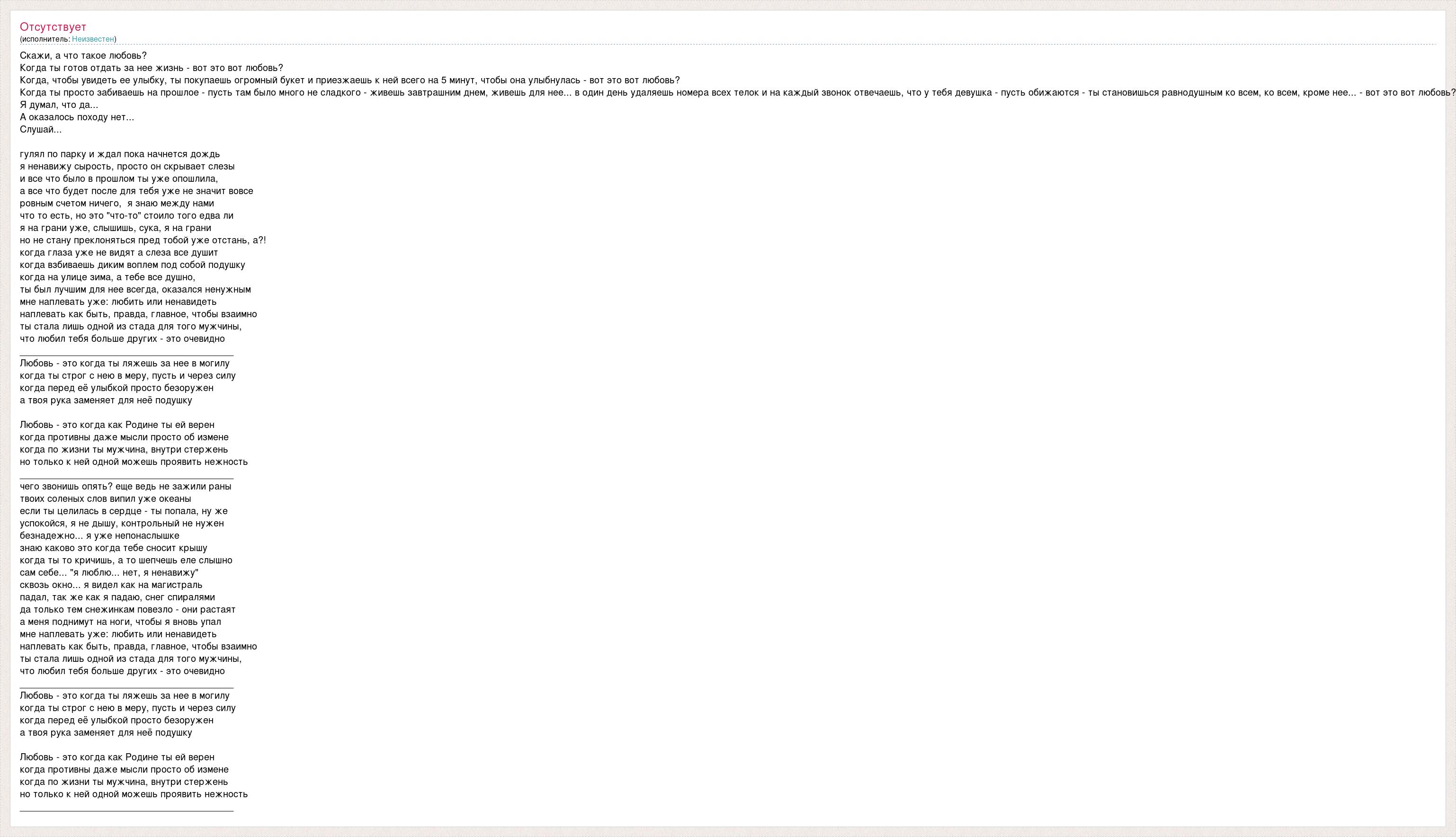 Скажи, а что такое любовь? Когда ты готов отдать за нее жизнь - вот это вот любовь? Когда, чтобы увидеть ее улыбку, ты покупаешь огромный букет и приезжаешь к ней всего на 5 минут, чтобы она улыбнулась - вот это вот любовь? Когда ты просто забиваешь на прошлое - пусть там было много не сладкого - живешь завтрашним днем, живешь для нее... в один день удаляешь номера всех телок и на каждый звонок отвечаешь, что у тебя девушка - пусть обижаются - ты становишься равнодушным ко всем, ко всем, кроме нее... - вот это вот любовь? Я думал, что да... А оказалось походу нет... Слушай... гулял по парку и ждал пока начнется дождь я ненавижу сырость, просто он скрывает слезы и все что было в прошлом ты уже опошлила, а все что будет после для тебя уже не значит вовсе ровным счетом ничего, я знаю между нами что то есть, но это "что-то" стоило того едва ли я на грани уже, слышишь, сука, я на грани но не стану преклоняться пред тобой уже отстань, а?! когда глаза уже не видят а слеза все душит когда взбиваешь диким воплем под собой подушку когда на улице зима, а тебе все душно, ты был лучшим для нее всегда, оказался ненужным мне наплевать уже: любить или ненавидеть наплевать как быть, правда, главное, чтобы взаимно ты стала лишь одной из стада для того мужчины, что любил тебя больше других - это очевидно _________________________________________ Любовь - это когда ты ляжешь за нее в могилу когда ты строг с нею в меру, пусть и через силу когда перед её улыбкой просто безоружен а твоя рука заменяет для неё подушку Любовь - это когда как Родине ты ей верен когда противны даже мысли просто об измене когда по жизни ты мужчина, внутри стержень но только к ней одной можешь проявить нежность _________________________________________ чего звонишь опять? еще ведь не зажили раны твоих соленых слов випил уже океаны если ты целилась в сердце - ты попала, ну же успокойся, я не дышу, контрольный не нужен безнадежно... я уже непонаслышке знаю каково это когда тебе сносит крышу когда ты то кричишь, а то шепчешь еле слышно сам себе... "я люблю... нет, я ненавижу" сквозь окно... я видел как на магистраль падал, так же как я падаю, снег спиралями да только тем снежинкам повезло - они растаят а меня поднимут на ноги, чтобы я вновь упал мне наплевать уже: любить или ненавидеть наплевать как быть, правда, главное, чтобы взаимно ты стала лишь одной из стада для того мужчины, что любил тебя больше других - это очевидно _________________________________________ Любовь - это когда ты ляжешь за нее в могилу когда ты строг с нею в меру, пусть и через силу когда перед её улыбкой просто безоружен а твоя рука заменяет для неё подушку Любовь - это когда как Родине ты ей верен когда противны даже мысли просто об измене когда по жизни ты мужчина, внутри стержень но только к ней одной можешь проявить нежность _________________________________________