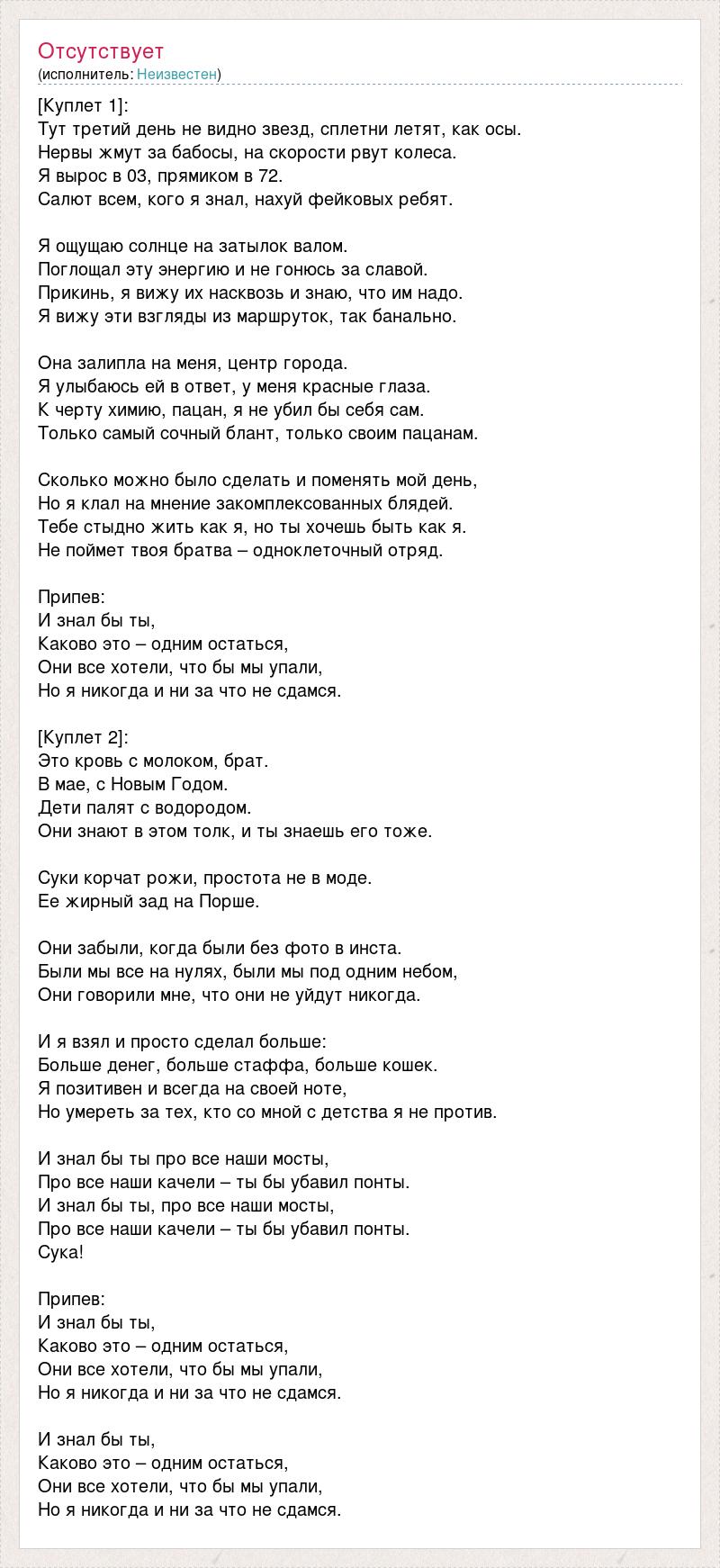 [Куплет 1]: Тут третий день не видно звезд, cплетни летят, как осы. Нервы жмут за бабосы, на скорости рвут колеса. Я вырос в 03, прямиком в 72. Салют всем, кого я знал, нахуй фейковых ребят. Я ощущаю солнце на затылок валом. Поглощал эту энергию и не гонюсь за славой. Прикинь, я вижу их насквозь и знаю, что им надо. Я вижу эти взгляды из маршруток, так банально. Она залипла на меня, центр города. Я улыбаюсь ей в ответ, у меня красные глаза. К черту химию, пацан, я не убил бы себя сам. Только самый сочный блант, только своим пацанам. Сколько можно было сделать и поменять мой день, Но я клал на мнение закомплексованных блядей. Тебе стыдно жить как я, но ты хочешь быть как я. Не поймет твоя братва – одноклеточный отряд. Припев: И знал бы ты, Каково это – одним остаться, Они все хотели, что бы мы упали, Но я никогда и ни за что не сдамся. [Куплет 2]: Это кровь с молоком, брат. В мае, с Новым Годом. Дети палят с водородом. Они знают в этом толк, и ты знаешь его тоже. Суки корчат рожи, простота не в моде. Ее жирный зад на Порше. Они забыли, когда были без фото в инста. Были мы все на нулях, были мы под одним небом, Они говорили мне, что они не уйдут никогда. И я взял и просто сделал больше: Больше денег, больше стаффа, больше кошек. Я позитивен и всегда на своей ноте, Но умереть за тех, кто со мной с детства я не против. И знал бы ты про все наши мосты, Про все наши качели – ты бы убавил понты. И знал бы ты, про все наши мосты, Про все наши качели – ты бы убавил понты. Сука! Припев: И знал бы ты, Каково это – одним остаться, Они все хотели, что бы мы упали, Но я никогда и ни за что не сдамся. И знал бы ты, Каково это – одним остаться, Они все хотели, что бы мы упали, Но я никогда и ни за что не сдамся.