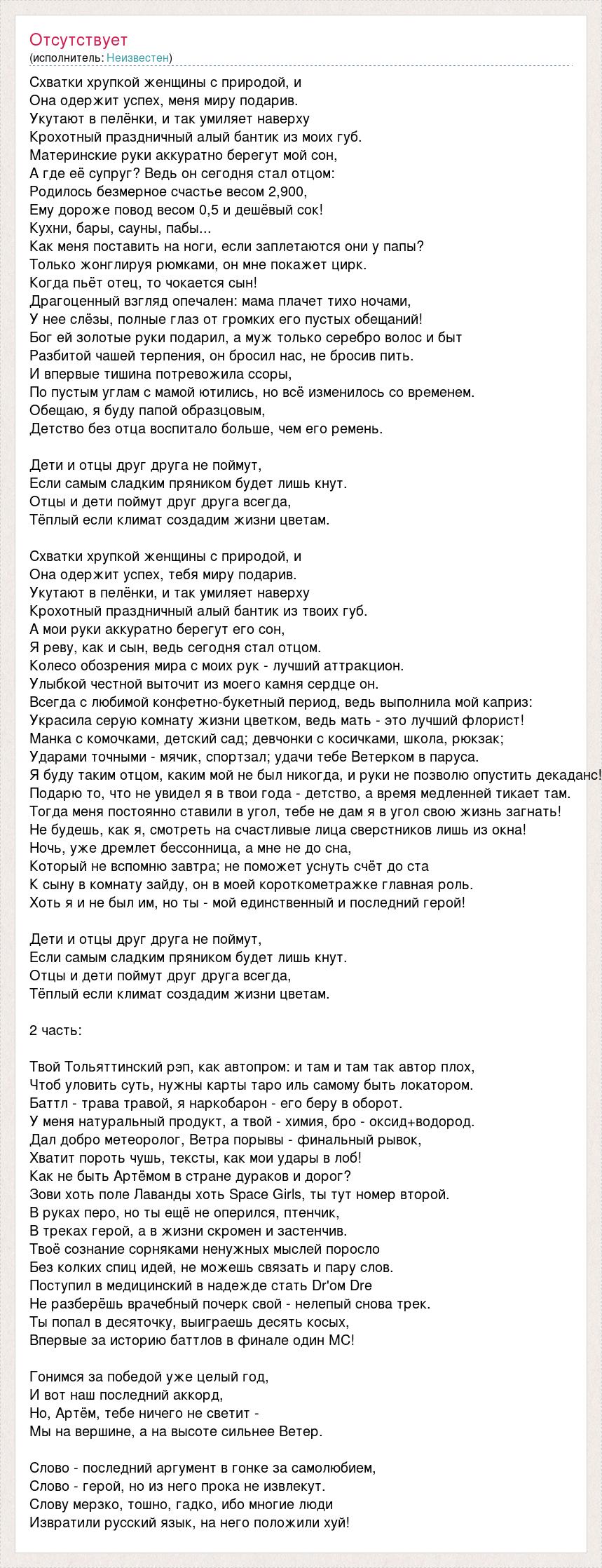Схватки хрупкой женщины с природой, и Она одержит успех, меня миру подарив. Укутают в пелёнки, и так умиляет наверху Крохотный праздничный алый бантик из моих губ. Материнские руки аккуратно берегут мой сон, А где её супруг? Ведь он сегодня стал отцом: Родилось безмерное счастье весом 2,900, Ему дороже повод весом 0,5 и дешёвый сок! Кухни, бары, сауны, пабы... Как меня поставить на ноги, если заплетаются они у папы? Только жонглируя рюмками, он мне покажет цирк. Когда пьёт отец, то чокается сын! Драгоценный взгляд опечален: мама плачет тихо ночами, У нее слёзы, полные глаз от громких его пустых обещаний! Бог ей золотые руки подарил, а муж только серебро волос и быт Разбитой чашей терпения, он бросил нас, не бросив пить. И впервые тишина потревожила ссоры, По пустым углам с мамой ютились, но всё изменилось со временем. Обещаю, я буду папой образцовым, Детство без отца воспитало больше, чем его ремень. Дети и отцы друг друга не поймут, Если самым сладким пряником будет лишь кнут. Отцы и дети поймут друг друга всегда, Тёплый если климат создадим жизни цветам. Схватки хрупкой женщины с природой, и Она одержит успех, тебя миру подарив. Укутают в пелёнки, и так умиляет наверху Крохотный праздничный алый бантик из твоих губ. А мои руки аккуратно берегут его сон, Я реву, как и сын, ведь сегодня стал отцом. Колесо обозрения мира с моих рук - лучший аттракцион. Улыбкой честной выточит из моего камня сердце он. Всегда с любимой конфетно-букетный период, ведь выполнила мой каприз: Украсила серую комнату жизни цветком, ведь мать - это лучший флорист! Манка с комочками, детский сад; девчонки с косичками, школа, рюкзак; Ударами точными - мячик, спортзал; удачи тебе Ветерком в паруса. Я буду таким отцом, каким мой не был никогда, и руки не позволю опустить декаданс! Подарю то, что не увидел я в твои года - детство, а время медленней тикает там. Тогда меня постоянно ставили в угол, тебе не дам я в угол свою жизнь загнать! Не будешь, как я, смотреть на счастливые лица сверстников лишь из окна! Ночь, уже дремлет бессонница, а мне не до сна, Который не вcпомню завтра; не поможет уснуть счёт до ста К сыну в комнату зайду, он в моей короткометражке главная роль. Хоть я и не был им, но ты - мой единственный и последний герой! Дети и отцы друг друга не поймут, Если самым сладким пряником будет лишь кнут. Отцы и дети поймут друг друга всегда, Тёплый если климат создадим жизни цветам. 2 часть: Твой Тольяттинский рэп, как автопром: и там и там так автор плох, Чтоб уловить суть, нужны карты таро иль самому быть локатором. Баттл - трава травой, я наркобарон - его беру в оборот. У меня натуральный продукт, а твой - химия, бро - оксид+водород. Дал добро метеоролог, Ветра порывы - финальный рывок, Хватит пороть чушь, тексты, как мои удары в лоб! Как не быть Артёмом в стране дураков и дорог? Зови хоть поле Лаванды хоть Space Girls, ты тут номер второй. В руках перо, но ты ещё не оперился, птенчик, В треках герой, а в жизни скромен и застенчив. Твоё сознание сорняками ненужных мыслей поросло Без колких спиц идей, не можешь связать и пару слов. Поступил в медицинский в надежде стать Dr'ом Dre Не разберёшь врачебный почерк свой - нелепый снова трек. Ты попал в десяточку, выиграешь десять косых, Впервые за историю баттлов в финале один МС! Гонимся за победой уже целый год, И вот наш последний аккорд, Но, Артём, тебе ничего не светит - Мы на 