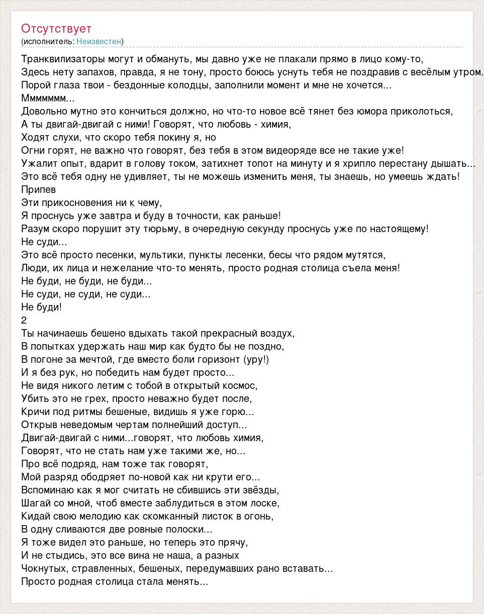 Транквилизаторы могут и обмануть, мы давно уже не плакали прямо в лицо кому-то, Здесь нету запахов, правда, я не тону, просто боюсь уснуть тебя не поздравив с весёлым утром. Порой глаза твои - бездонные колодцы, заполнили момент и мне не хочется... Ммммммм... Довольно мутно это кончиться должно, но что-то новое всё тянет без юмора приколоться, А ты двигай-двигай с ними! Говорят, что любовь - химия, Ходят слухи, что скоро тебя покину я, но Огни горят, не важно что говорят, без тебя в этом видеоряде все не такие уже! Ужалит опыт, вдарит в голову током, затихнет топот на минуту и я хрипло перестану дышать... Это всё тебя одну не удивляет, ты не можешь изменить меня, ты знаешь, но умеешь ждать! Припев Эти прикосновения ни к чему, Я проснусь уже завтра и буду в точности, как раньше! Разум скоро порушит эту тюрьму, в очередную секунду проснусь уже по настоящему! Не суди... Это всё просто песенки, мультики, пункты лесенки, бесы что рядом мутятся, Люди, их лица и нежелание что-то менять, просто родная столица съела меня! Не буди, не буди, не буди... Не суди, не суди, не суди... Не буди! 2 Ты начинаешь бешено вдыхать такой прекрасный воздух, В попытках удержать наш мир как будто бы не поздно, В погоне за мечтой, где вместо боли горизонт (уру!) И я без рук, но победить нам будет просто... Не видя никого летим с тобой в открытый космос, Убить это не грех, просто неважно будет после, Кричи под ритмы бешеные, видишь я уже горю... Открыв неведомым чертам полнейший доступ... Двигай-двигай с ними...говорят, что любовь химия, Говорят, что не стать нам уже такими же, но... Про всё подряд, нам тоже так говорят, Мой разряд ободряет по-новой как ни крути его... Вспоминаю как я мог считать не сбившись эти звёзды, Шагай со мной, чтоб вместе заблудиться в этом лоске, Кидай свою мелодию как скомканный листок в огонь, В одну сливаются две ровные полоски... Я тоже видел это раньше, но теперь это прячу, И не стыдись, это все вина не наша, а разных Чокнутых, стравленных, бешеных, передумавших рано вставать... Просто родная столица стала менять...