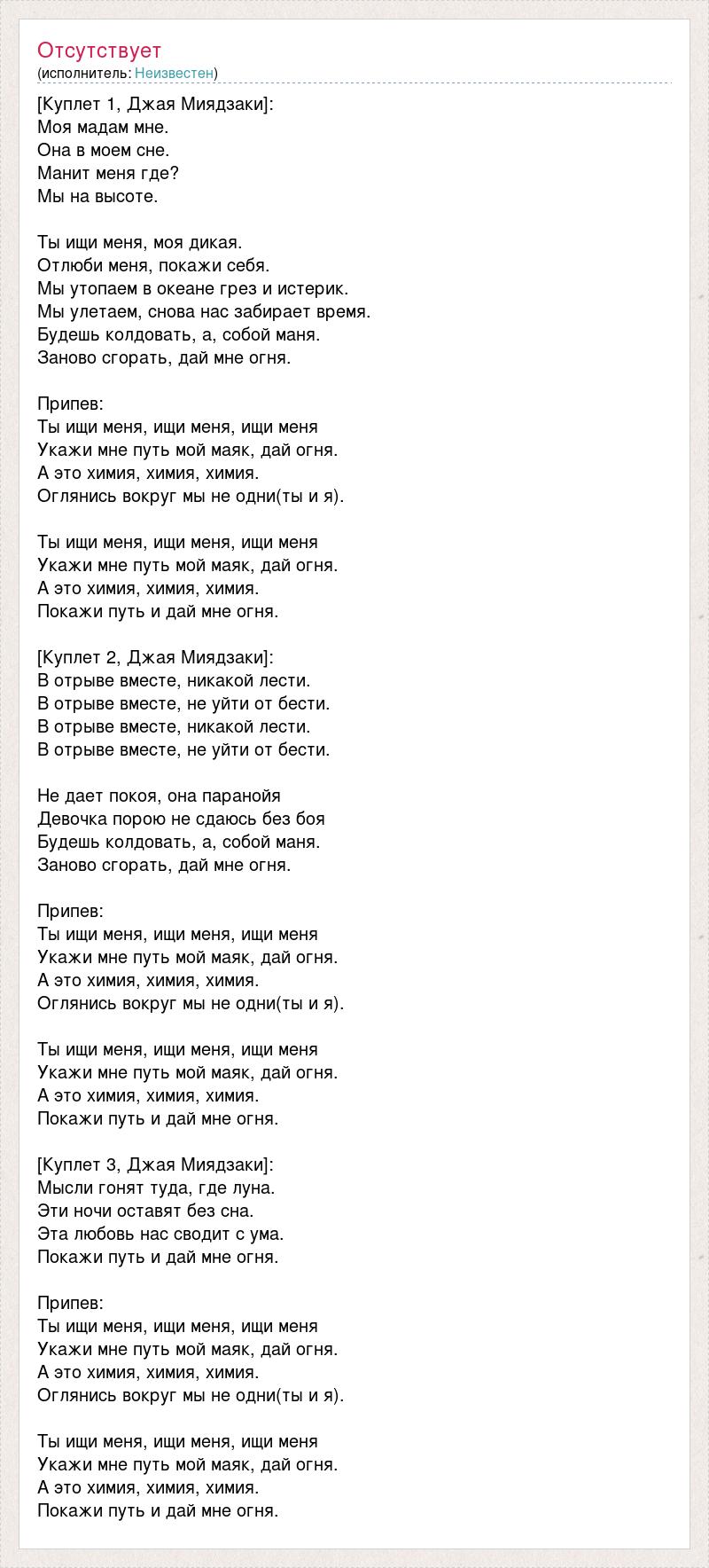 [Куплет 1, Джая Миядзаки]: Моя мадам мне. Она в моем сне. Манит меня где? Мы на высоте. Ты ищи меня, моя дикая. Отлюби меня, покажи себя. Мы утопаем в океане грез и истерик. Мы улетаем, снова нас забирает время. Будешь колдовать, а, собой маня. Заново сгорать, дай мне огня. Припев: Ты ищи меня, ищи меня, ищи меня Укажи мне путь мой маяк, дай огня. А это химия, химия, химия. Оглянись вокруг мы не одни(ты и я). Ты ищи меня, ищи меня, ищи меня Укажи мне путь мой маяк, дай огня. А это химия, химия, химия. Покажи путь и дай мне огня. [Куплет 2, Джая Миядзаки]: В отрыве вместе, никакой лести. В отрыве вместе, не уйти от бести. В отрыве вместе, никакой лести. В отрыве вместе, не уйти от бести. Не дает покоя, она паранойя Девочка порою не сдаюсь без боя Будешь колдовать, а, собой маня. Заново сгорать, дай мне огня. Припев: Ты ищи меня, ищи меня, ищи меня Укажи мне путь мой маяк, дай огня. А это химия, химия, химия. Оглянись вокруг мы не одни(ты и я). Ты ищи меня, ищи меня, ищи меня Укажи мне путь мой маяк, дай огня. А это химия, химия, химия. Покажи путь и дай мне огня. [Куплет 3, Джая Миядзаки]: Мысли гонят туда, где луна. Эти ночи оставят без сна. Эта любовь нас сводит с ума. Покажи путь и дай мне огня. Припев: Ты ищи меня, ищи меня, ищи меня Укажи мне путь мой маяк, дай огня. А это химия, химия, химия. Оглянись вокруг мы не одни(ты и я). Ты ищи меня, ищи меня, ищи меня Укажи мне путь мой маяк, дай огня. А это химия, химия, химия. Покажи путь и дай мне огня.