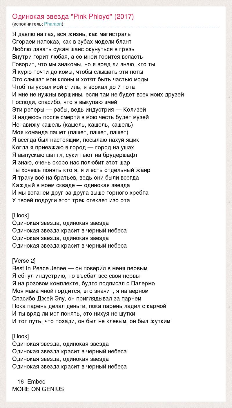 Я давлю на газ, вся жизнь, как магистраль Сгораем напоказ, как в зубах модели блант Люблю давать сукам шанс окунуться в грязь Внутри горит любая, а со мной горится всласть Говорит, что мы знакомы, но я вряд ли знаю, кто ты Я курю почти до комы, чтобы слышать эти ноты Это слышат мои клоны и хотят быть частью моды Чтоб ты украл мой стиль, я воркал до 7 пота И мне не нужны вершины, если там не будет всех моих друзей Господи, спасибо, что я выкупаю змей Эти рэперы — рабы, ведь индустрия — Колизей Я надеюсь после смерти в мою честь будет музей Ненавижу кашель (кашель, кашель, кашель) Моя команда пашет (пашет, пашет, пашет) Я всегда был настоящим, посылаю нахуй ящик Когда я приезжаю в город — город на ушах Я выпускаю шаттл, суки пьют на брудершафт Я знаю, очень скоро нас полюбит этот шар Ты хочешь понять кто я, я и есть отдельный жанр Я трачу всё на братьев, ведь они были всегда Каждый в моем скваде — одинокая звезда И мы встанем друг за друга выше горного хребта У твоей подруги этот трек стекает изо рта [Hook] Одинокая звезда, одинокая звезда Одинокая звезда красит в черный небеса Одинокая звезда, одинокая звезда Одинокая звезда красит в черный небеса [Verse 2] Rest In Peace Jenee — он поверил в меня первым Я ебнул индустрию, но въебал все свои нервы Я на розовом комплекте, будто подписал с Палермо Моя мама мной гордится, это значит, я на верном Спасибо Джей Элу, он приглядывал за парнем Пока парень делал деньги, пока парень ладил с кармой И ты вряд ли мог понять, это нихуя не шутки И тот путь, что позади, он был не клевым, он был жутким [Hook] Одинокая звезда, одинокая звезда Одинокая звезда красит в черный небеса Одинокая звезда, одинокая звезда Одинокая звезда красит в черный небеса 16 Embed MORE ON GENIUS
