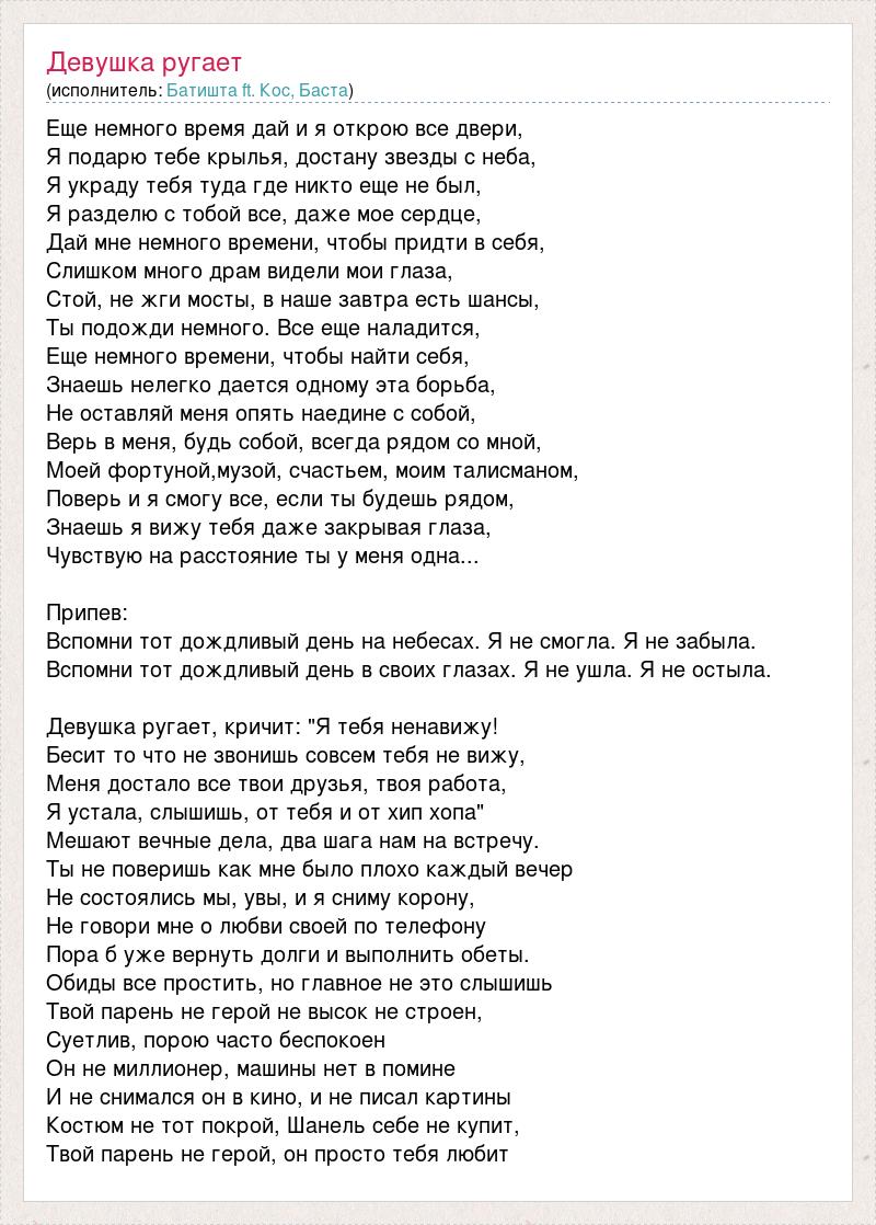 Еще немного время дай и я открою все двери, Я подарю тебе крылья, достану звезды с неба, Я украду тебя туда где никто еще не был, Я разделю с тобой все, даже мое сердце, Дай мне немного времени, чтобы придти в себя, Слишком много драм видели мои глаза, Стой, не жги мосты, в наше завтра есть шансы, Ты подожди немного. Все еще наладится, Еще немного времени, чтобы найти себя, Знаешь нелегко дается одному эта борьба, Не оставляй меня опять наедине с собой, Верь в меня, будь собой, всегда рядом со мной, Моей фортуной,музой, счастьем, моим талисманом, Поверь и я смогу все, если ты будешь рядом, Знаешь я вижу тебя даже закрывая глаза, Чувствую на расстояние ты у меня одна... Припев: Вспомни тот дождливый день на небесах. Я не смогла. Я не забыла. Вспомни тот дождливый день в своих глазах. Я не ушла. Я не остыла. Девушка ругает, кричит: "Я тебя ненавижу! Бесит то что не звонишь совсем тебя не вижу, Меня достало все твои друзья, твоя работа, Я устала, слышишь, от тебя и от хип хопа" Мешают вечные дела, два шага нам на встречу. Ты не поверишь как мне было плохо каждый вечер Не состоялись мы, увы, и я сниму корону, Не говори мне о любви своей по телефону Пора б уже вернуть долги и выполнить обеты. Обиды все простить, но главное не это слышишь Твой парень не герой не высок не строен, Суетлив, порою часто беспокоен Он не миллионер, машины нет в помине И не снимался он в кино, и не писал картины Костюм не тот покрой, Шанель себе не купит, Твой парень не герой, он просто тебя любит