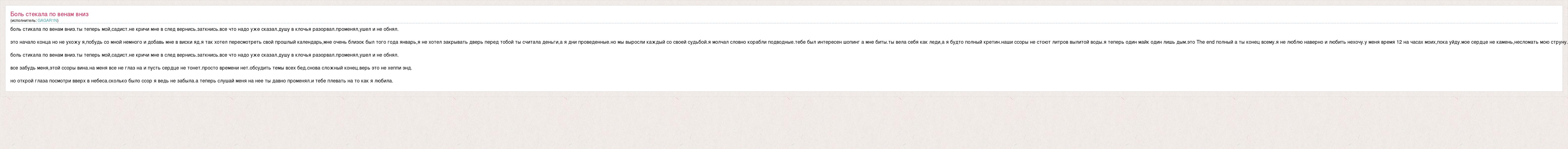 Главная→Исполнители→Неизвестен→боль стикала по венам вниз.ты теперь мой,садист.не кричи мне в след вернись.затк