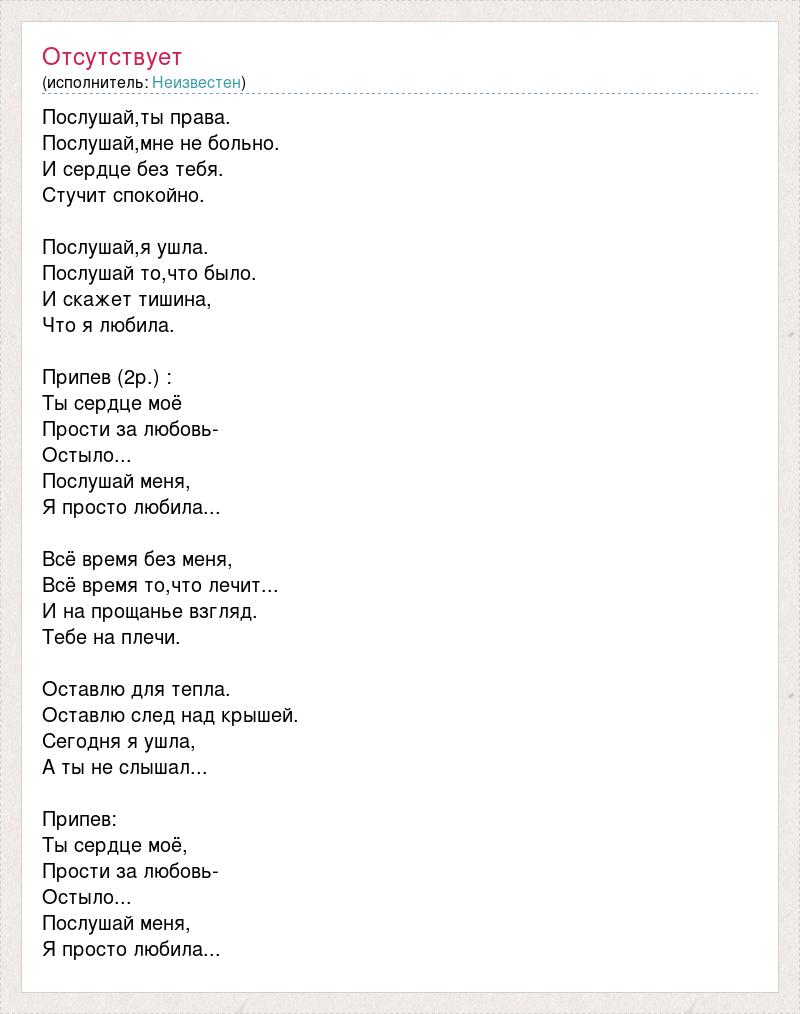 Послушай,ты права. Послушай,мне не больно. И сердце без тебя. Стучит спокойно. Послушай,я ушла. Послушай то,что было. И скажет тишина, Что я любила. Припев (2р.) : Ты сердце моё Прости за любовь- Остыло... Послушай меня, Я просто любила... Всё время без меня, Всё время то,что лечит... И на прощанье взгляд. Тебе на плечи. Оставлю для тепла. Оставлю след над крышей. Сегодня я ушла, А ты не слышал... Припев: Ты сердце моё, Прости за любовь- Остыло... Послушай меня, Я просто любила...