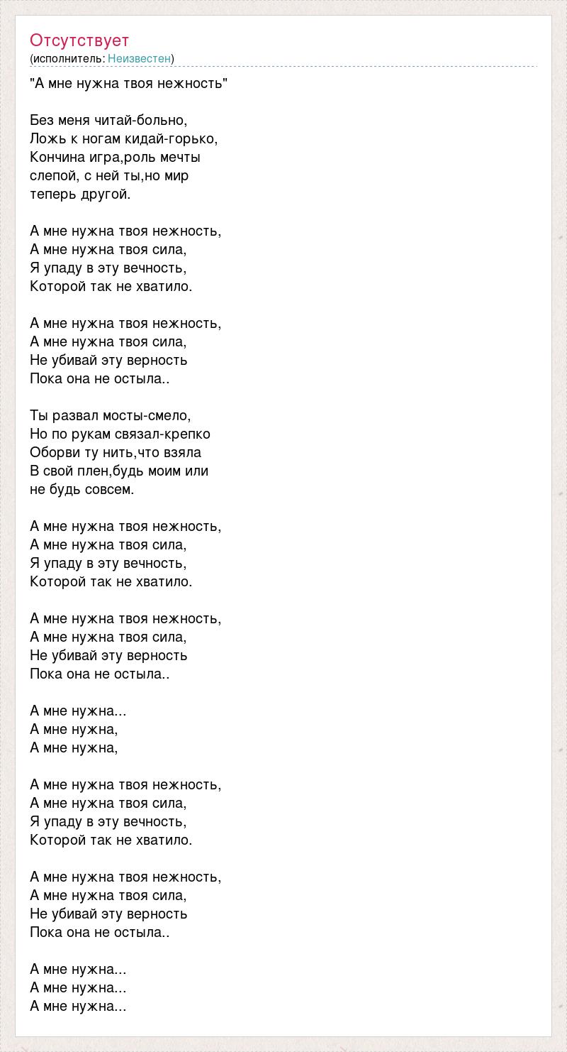 "А мне нужна твоя нежность" Без меня читай-больно, Ложь к ногам кидай-горько, Кончина игра,роль мечты слепой, с ней ты,но мир теперь другой. А мне нужна твоя нежность, А мне нужна твоя сила, Я упаду в эту вечность, Которой так не хватило. А мне нужна твоя нежность, А мне нужна твоя сила, Не убивай эту верность Пока она не остыла.. Ты развал мосты-смело, Но по рукам связал-крепко Оборви ту нить,что взяла В свой плен,будь моим или не будь совсем. А мне нужна твоя нежность, А мне нужна твоя сила, Я упаду в эту вечность, Которой так не хватило. А мне нужна твоя нежность, А мне нужна твоя сила, Не убивай эту верность Пока она не остыла.. А мне нужна... А мне нужна, А мне нужна, А мне нужна твоя нежность, А мне нужна твоя сила, Я упаду в эту вечность, Которой так не хватило. А мне нужна твоя нежность, А мне нужна твоя сила, Не убивай эту верность Пока она не остыла.. А мне нужна... А мне нужна... А мне нужна...