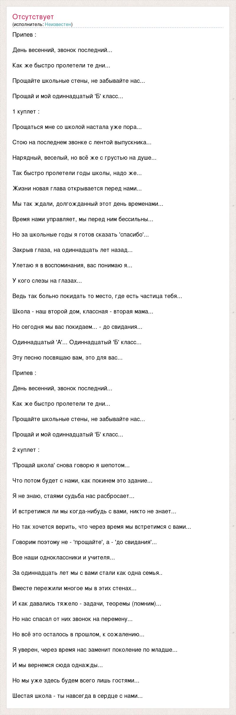 Припев : День весенний, звонок последний... Как же быстро пролетели те дни... Прощайте школьные стены, не забывайте нас... Прощай и мой одиннадцатый 'Б' класс... 1 куплет : Прощаться мне со школой настала уже пора... Стою на последнем звонке с лентой выпускника... Нарядный, веселый, но всё же с грустью на душе... Так быстро пролетели годы школы, надо же... Жизни новая глава открывается перед нами... Мы так ждали, долгожданный этот день временами... Время нами управляет, мы перед ним бессильны... Но за школьные годы я готов сказать 'спасибо'... Закрыв глаза, на одиннадцать лет назад... Улетаю я в воспоминания, вас понимаю я... У кого слезы на глазах... Ведь так больно покидать то место, где есть частица тебя... Школа - наш второй дом, классная - вторая мама... Но сегодня мы вас покидаем... - до свидания... Одиннадцатый 'А'... Одиннадцатый 'Б' класс... Эту песню посвящаю вам, это для вас... Припев : День весенний, звонок последний... Как же быстро пролетели те дни... Прощайте школьные стены, не забывайте нас... Прощай и мой одиннадцатый 'Б' класс... 2 куплет : 'Прощай школа' снова говорю я шепотом... Что потом будет с нами, как покинем это здание... Я не знаю, стаями судьба нас расбросает... И встретимся ли мы когда-нибудь с вами, никто не знает... Но так хочется верить, что через время мы встретимся с вами... Говорим поэтому не - 'прощайте', а - 'до свидания'... Все наши одноклассники и учителя... За одиннадцать лет мы с вами стали как одна семья.. Вместе пережили многое мы в этих стенах... И как давались тяжело - задачи, теоремы (помним)... Но нас спасал от них звонок на перемену... Но всё это осталось в прошлом, к сожалению... Я уверен, через время нас заменит поколение по младше... И мы вернемся сюда однажды... Но мы уже здесь будем всего лишь гостями... Шестая школа - ты навсегда в сердце с нами...