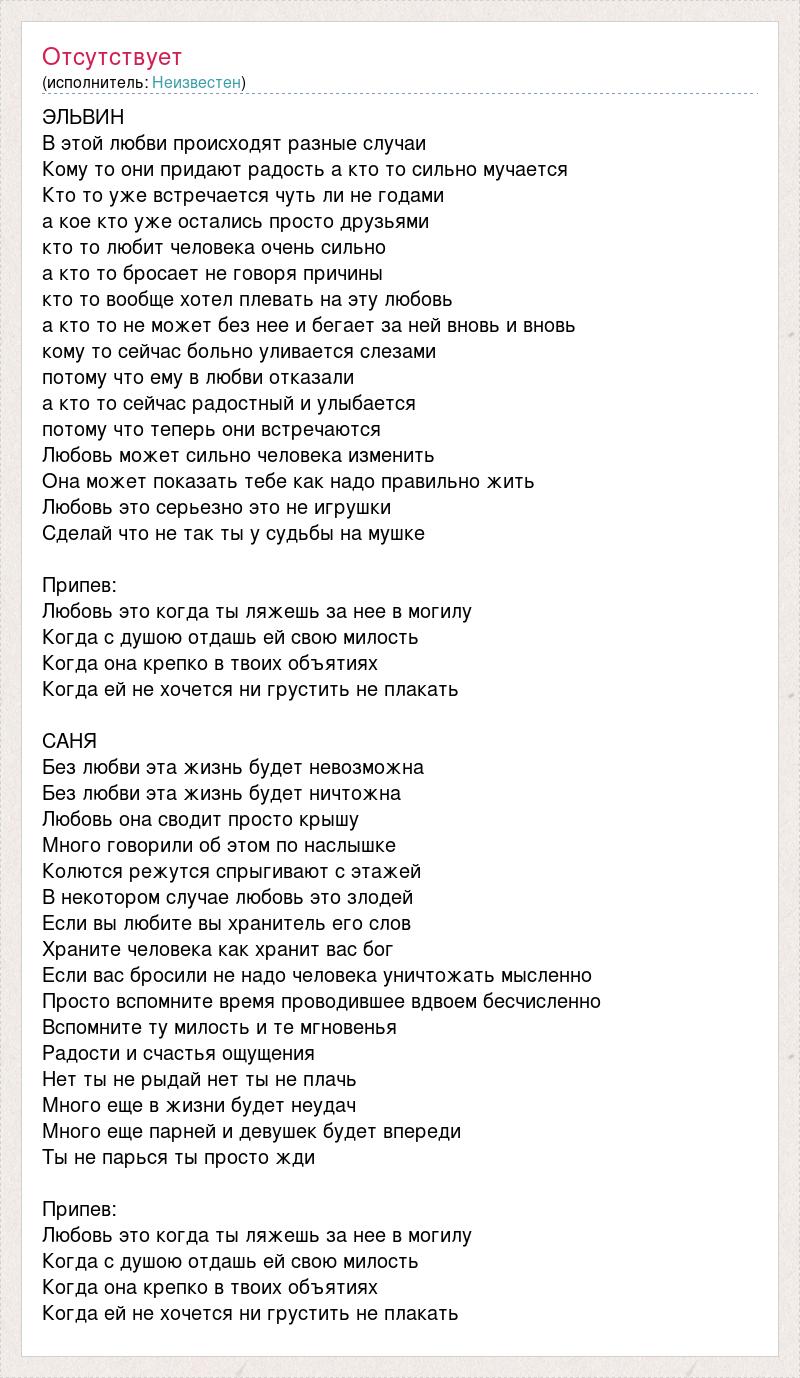 ЭЛЬВИН В этой любви происходят разные случаи Кому то они придают радость а кто то сильно мучается Кто то уже встречается чуть ли не годами а кое кто уже остались просто друзьями кто то любит человека очень сильно а кто то бросает не говоря причины кто то вообще хотел плевать на эту любовь а кто то не может без нее и бегает за ней вновь и вновь кому то сейчас больно уливается слезами потому что ему в любви отказали а кто то сейчас радостный и улыбается потому что теперь они встречаются Любовь может сильно человека изменить Она может показать тебе как надо правильно жить Любовь это серьезно это не игрушки Сделай что не так ты у судьбы на мушке Припев: Любовь это когда ты ляжешь за нее в могилу Когда с душою отдашь ей свою милость Когда она крепко в твоих объятиях Когда ей не хочется ни грустить не плакать САНЯ Без любви эта жизнь будет невозможна Без любви эта жизнь будет ничтожна Любовь она сводит просто крышу Много говорили об этом по наслышке Колются режутся спрыгивают с этажей В некотором случае любовь это злодей Если вы любите вы хранитель его слов Храните человека как хранит вас бог Если вас бросили не надо человека уничтожать мысленно Просто вспомните время проводившее вдвоем бесчисленно Вспомните ту милость и те мгновенья Радости и счастья ощущения Нет ты не рыдай нет ты не плачь Много еще в жизни будет неудач Много еще парней и девушек будет впереди Ты не парься ты просто жди Припев: Любовь это когда ты ляжешь за нее в могилу Когда с душою отдашь ей свою милость Когда она крепко в твоих объятиях Когда ей не хочется ни грустить не плакать