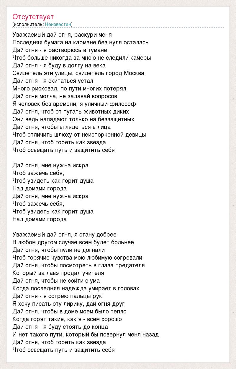 Уважаемый дай огня, раскури меня Последняя бумага на кармане без нуля осталась Дай огня - я растворюсь в тумане Чтоб больше никогда за мною не следили камеры Дай огня - я буду в долгу на века Свидетель эти улицы, свидетель город Москва Дай огня - я скитаться устал Много рисковал, по пути многих потерял Дай огня молча, не задавай вопросов Я человек без времени, я уличный философ Дай огня, чтоб от пугать животных диких Они ведь нападают только на беззащитных Дай огня, чтобы вглядеться в лица Чтоб отличить шлюху от неиспорченной девицы Дай огня, чтоб гореть как звезда Чтоб освещать путь и защитить себя Дай огня, мне нужна искра Чтоб зажечь себя, Чтоб увидеть как горит душа Над домами города Дай огня, мне нужна искра Чтоб зажечь себя, Чтоб увидеть как горит душа Над домами города Уважаемый дай огня, я стану добрее В любом другом случае всем будет больнее Дай огня, чтобы пули не догнали Чтоб горячие чувства мою любимую согревали Дай огня, чтобы посмотреть в глаза предателя Который за лавэ продал учителя Дай огня, чтобы не сойти с ума Когда последняя надежда умирает в головах Дай огня - я согрею пальцы рук Я хочу писать эту лирику, дай огня друг Дай огня, чтобы в доме моем было тепло Когда горят такие, как я - всем хорошо Дай огня - я буду стоять до конца И нет такого пути, который бы повернул меня назад Дай огня, чтоб гореть как звезда Чтоб освещать путь и защитить себя