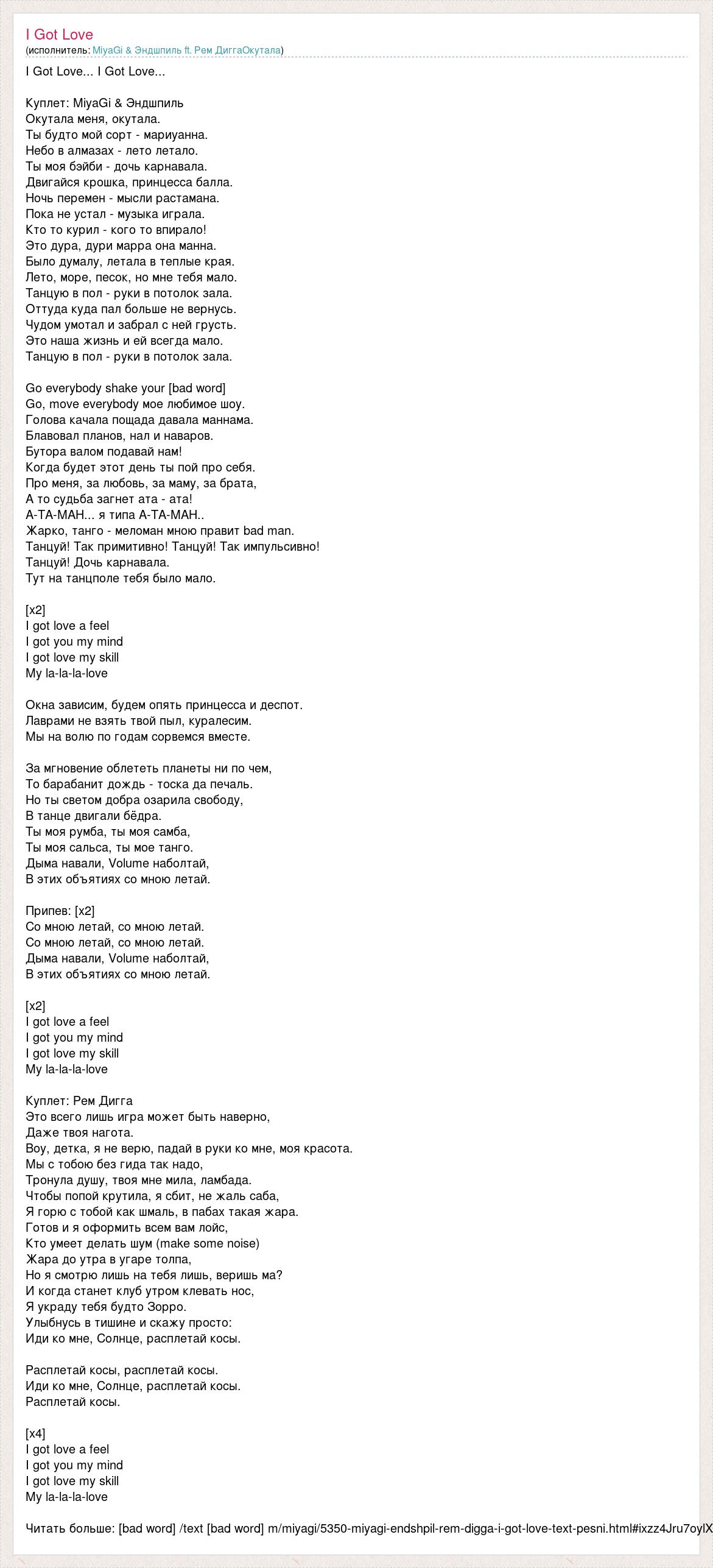 I Got Love... I Got Love... Куплет: MiyaGi & Эндшпиль Окутала меня, окутала. Ты будто мой сорт - мариуанна. Небо в алмазах - лето летало. Ты моя бэйби - дочь карнавала. Двигайся крошка, принцесса балла. Ночь перемен - мысли растамана. Пока не устал - музыка играла. Кто то курил - кого то впирало! Это дура, дури марра она манна. Было думалу, летала в теплые края. Лето, море, песок, но мне тебя мало. Танцую в пол - руки в потолок зала. Оттуда куда пал больше не вернусь. Чудом умотал и забрал с ней грусть. Это наша жизнь и ей всегда мало. Танцую в пол - руки в потолок зала. Go everybody shake your [bad word] Go, move everybody мое любимое шоу. Голова качала пощада давала маннама. Блавовал планов, нал и наваров. Бутора валом подавай нам! Когда будет этот день ты пой про себя. Про меня, за любовь, за маму, за брата, А то судьба загнет ата - ата! А-ТА-МАН... я типа А-ТА-МАН.. Жарко, танго - меломан мною правит bad man. Танцуй! Так примитивно! Танцуй! Так импульсивно! Танцуй! Дочь карнавала. Тут на танцполе тебя было мало. [x2] I got love a feel I got you my mind I got love my skill My la-la-la-love Окна зависим, будем опять принцесса и деспот. Лаврами не взять твой пыл, куралесим. Мы на волю по годам сорвемся вместе. За мгновение облететь планеты ни по чем, То барабанит дождь - тоска да печаль. Но ты светом добра озарила свободу, В танце двигали бёдра. Ты моя румба, ты моя самба, Ты моя сальса, ты мое танго. Дыма навали, Volume наболтай, В этих объятиях со мною летай. Припев: [х2] Со мною летай, со мною летай. Со мною летай, со мною летай. Дыма навали, Volume наболтай, В этих объятиях со мною летай. [х2] I got love a feel I got you my mind I got love my skill My la-la-la-love Куплет: Рем Дигга Это всего лишь игра может быть наверно, Даже твоя нагота. Воу, детка, я не верю, падай в руки ко мне, моя красота. Мы с тобою без гида так надо, Тронула душу, твоя мне мила, ламбада. Чтобы попой крутила, я сбит, не жаль саба, Я горю с тобой как шмаль, в пабах такая жара. Готов и я оформить всем вам лойс, Кто умеет делать шум (make some noise) Жара до утра в угаре толпа, Но я смотрю лишь на тебя лишь, веришь ма? И когда станет клуб утром клевать нос, Я украду тебя будто Зорро. Улыбнусь в тишине и скажу просто: Иди ко мне, Солнце, расплетай косы. Расплетай косы, расплетай косы. Иди ко мне, Солнце, расплетай косы. Расплетай косы. [x4] I got love a feel I got you my mind I got love my skill My la-la-la-love Читать больше: [bad word] /text [bad word] m/miyagi/5350-miyagi-endshpil-rem-digga-i-got-love-text-pesni.html#ixzz4Jru7oylX