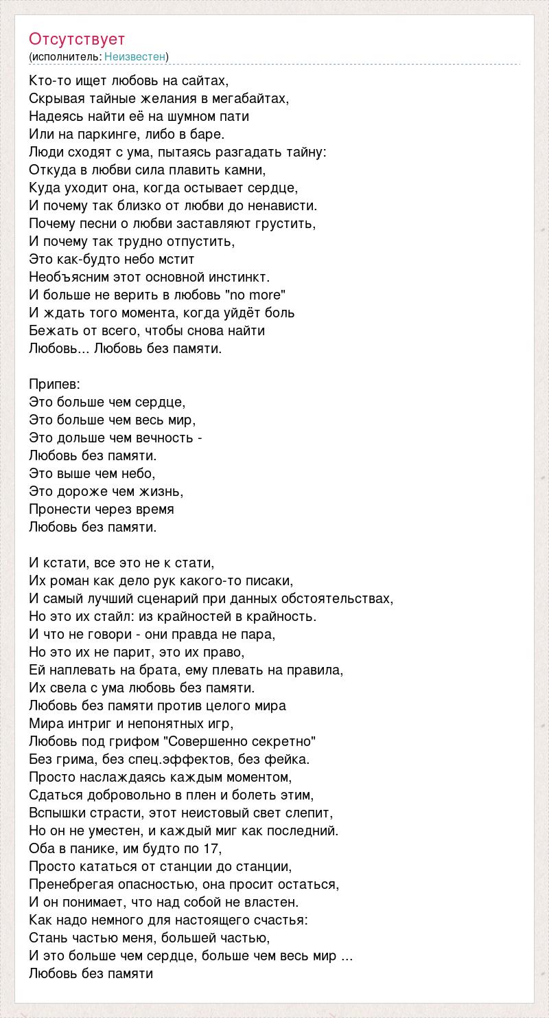Кто-то ищет любовь на сайтах, Скрывая тайные желания в мегабайтах, Надеясь найти её на шумном пати Или на паркинге, либо в баре. Люди сходят с ума, пытаясь разгадать тайну: Откуда в любви сила плавить камни, Куда уходит она, когда остывает сердце, И почему так близко от любви до ненависти. Почему песни о любви заставляют грустить, И почему так трудно отпустить, Это как-будто небо мстит Необъясним этот основной инстинкт. И больше не верить в любовь "no more" И ждать того момента, когда уйдёт боль Бежать от всего, чтобы снова найти Любовь... Любовь без памяти. Припев: Это больше чем сердце, Это больше чем весь мир, Это дольше чем вечность - Любовь без памяти. Это выше чем небо, Это дороже чем жизнь, Пронести через время Любовь без памяти. И кстати, все это не к стати, Их роман как дело рук какого-то писаки, И самый лучший сценарий при данных обстоятельствах, Но это их стайл: из крайностей в крайность. И что не говори - они правда не пара, Но это их не парит, это их право, Ей наплевать на брата, ему плевать на правила, Их свела с ума любовь без памяти. Любовь без памяти против целого мира Мира интриг и непонятных игр, Любовь под грифом "Совершенно секретно" Без грима, без спец.эффектов, без фейка. Просто наслаждаясь каждым моментом, Сдаться добровольно в плен и болеть этим, Вспышки страсти, этот неистовый свет слепит, Но он не уместен, и каждый миг как последний. Оба в панике, им будто по 17, Просто кататься от станции до станции, Пренебрегая опасностью, она просит остаться, И он понимает, что над собой не властен. Как надо немного для настоящего счастья: Стань частью меня, большей частью, И это больше чем сердце, больше чем весь мир ... Любовь без памяти