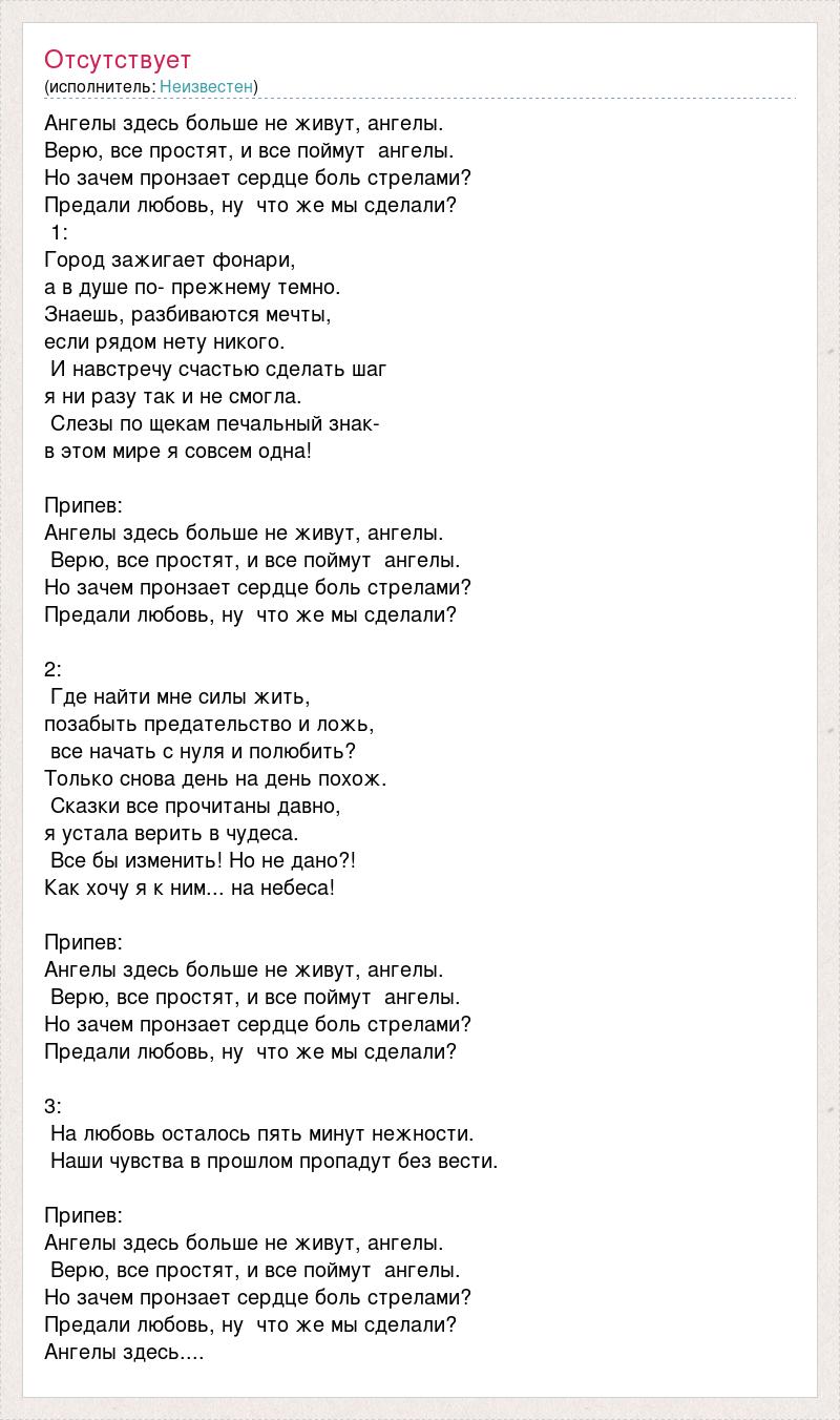 Ангелы здесь больше не живут, ангелы. Верю, все простят, и все поймут ангелы. Но зачем пронзает сердце боль стрелами? Предали любовь, ну что же мы сделали? 1: Город зажигает фонари, а в душе по- прежнему темно. Знаешь, разбиваются мечты, если рядом нету никого. И навстречу счастью сделать шаг я ни разу так и не смогла. Слезы по щекам печальный знак- в этом мире я совсем одна! Припев: Ангелы здесь больше не живут, ангелы. Верю, все простят, и все поймут ангелы. Но зачем пронзает сердце боль стрелами? Предали любовь, ну что же мы сделали? 2: Где найти мне силы жить, позабыть предательство и ложь, все начать с нуля и полюбить? Только снова день на день похож. Сказки все прочитаны давно, я устала верить в чудеса. Все бы изменить! Но не дано?! Как хочу я к ним... на небеса! Припев: Ангелы здесь больше не живут, ангелы. Верю, все простят, и все поймут ангелы. Но зачем пронзает сердце боль стрелами? Предали любовь, ну что же мы сделали? 3: На любовь осталось пять минут нежности. Наши чувства в прошлом пропадут без вести. Припев: Ангелы здесь больше не живут, ангелы. Верю, все простят, и все поймут ангелы. Но зачем пронзает сердце боль стрелами? Предали любовь, ну что же мы сделали? Ангелы здесь....