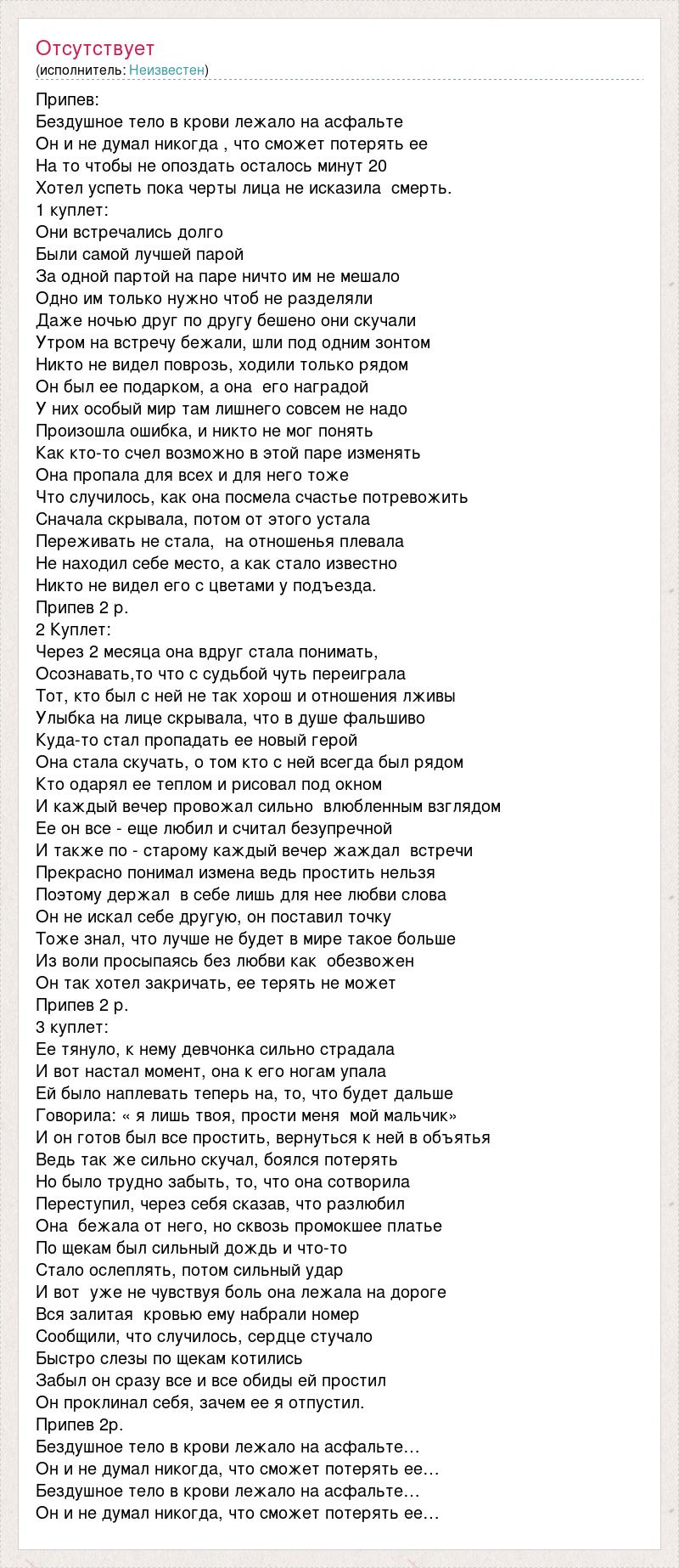 Припев: Бездушное тело в крови лежало на асфальте Он и не думал никогда , что сможет потерять ее На то чтобы не опоздать осталось минут 20 Хотел успеть пока черты лица не исказила смерть. 1 куплет: Они встречались долго Были самой лучшей парой За одной партой на паре ничто им не мешало Одно им только нужно чтоб не разделяли Даже ночью друг по другу бешено они скучали Утром на встречу бежали, шли под одним зонтом Никто не видел поврозь, ходили только рядом Он был ее подарком, а она его наградой У них особый мир там лишнего совсем не надо Произошла ошибка, и никто не мог понять Как кто-то счел возможно в этой паре изменять Она пропала для всех и для него тоже Что случилось, как она посмела счастье потревожить Сначала скрывала, потом от этого устала Переживать не стала, на отношенья плевала Не находил себе место, а как стало известно Никто не видел его с цветами у подъезда. Припев 2 р. 2 Куплет: Через 2 месяца она вдруг стала понимать, Осознавать,то что с судьбой чуть переиграла Тот, кто был с ней не так хорош и отношения лживы Улыбка на лице скрывала, что в душе фальшиво Куда-то стал пропадать ее новый герой Она стала скучать, о том кто с ней всегда был рядом Кто одарял ее теплом и рисовал под окном И каждый вечер провожал сильно влюбленным взглядом Ее он все - еще любил и считал безупречной И также по - старому каждый вечер жаждал встречи Прекрасно понимал измена ведь простить нельзя Поэтому держал в себе лишь для нее любви слова Он не искал себе другую, он поставил точку Тоже знал, что лучше не будет в мире такое больше Из воли просыпаясь без любви как обезвожен Он так хотел закричать, ее терять не может Припев 2 р. 3 куплет: Ее тянуло, к нему девчонка сильно страдала И вот настал момент, она к его ногам упала Ей было наплевать теперь на, то, что будет дальше Говорила: « я лишь твоя, прости меня мой мальчик» И он готов был все простить, вернуться к ней в объятья Ведь так же сильно скучал, боялся потерять Но было трудно забыть, то, что она сотворила Переступил, через себя сказав, что разлюбил Она бежала от него, но сквозь промокшее платье По щекам был сильный дождь и что-то Стало ослеплять, потом сильный удар И вот уже не чувствуя боль она лежала на дороге Вся залитая кровью ему набрали номер Сообщили, что случилось, сердце стучало Быстро слезы по щекам котились Забыл он сразу все и все обиды ей простил Он проклинал себя, зачем ее я отпустил. Припев 2р. Бездушное тело в крови лежало на асфальте… Он и не думал никогда, что сможет потерять ее… Бездушное тело в крови лежало на асфальте… Он и не думал никогда, что сможет потерять ее…