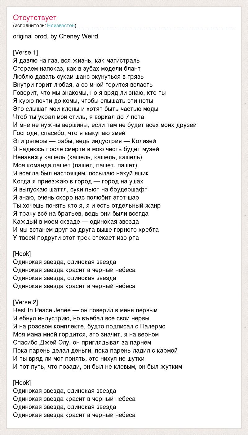original prod. by Cheney Weird [Verse 1] Я давлю на газ, вся жизнь, как магистраль Сгораем напоказ, как в зубах модели блант Люблю давать сукам шанс окунуться в грязь Внутри горит любая, а со мной горится всласть Говорит, что мы знакомы, но я вряд ли знаю, кто ты Я курю почти до комы, чтобы слышать эти ноты Это слышат мои клоны и хотят быть частью моды Чтоб ты украл мой стиль, я воркал до 7 пота И мне не нужны вершины, если там не будет всех моих друзей Господи, спасибо, что я выкупаю змей Эти рэперы — рабы, ведь индустрия — Колизей Я надеюсь после смерти в мою честь будет музей Ненавижу кашель (кашель, кашель, кашель) Моя команда пашет (пашет, пашет, пашет) Я всегда был настоящим, посылаю нахуй ящик Когда я приезжаю в город — город на ушах Я выпускаю шаттл, суки пьют на брудершафт Я знаю, очень скоро нас полюбит этот шар Ты хочешь понять кто я, я и есть отдельный жанр Я трачу всё на братьев, ведь они были всегда Каждый в моем скваде — одинокая звезда И мы встанем друг за друга выше горного хребта У твоей подруги этот трек стекает изо рта [Hook] Одинокая звезда, одинокая звезда Одинокая звезда красит в черный небеса Одинокая звезда, одинокая звезда Одинокая звезда красит в черный небеса [Verse 2] Rest In Peace Jenee — он поверил в меня первым Я ебнул индустрию, но въебал все свои нервы Я на розовом комплекте, будто подписал с Палермо Моя мама мной гордится, это значит, я на верном Спасибо Джей Элу, он приглядывал за парнем Пока парень делал деньги, пока парень ладил с кармой И ты вряд ли мог понять, это нихуя не шутки И тот путь, что позади, он был не клевым, он был жутким [Hook] Одинокая звезда, одинокая звезда Одинокая звезда красит в черный небеса Одинокая звезда, одинокая звезда Одинокая звезда красит в черный небеса