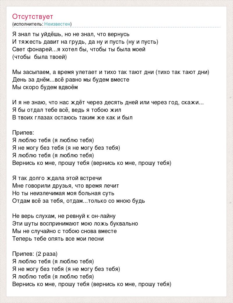 Я знал ты уйдёшь, но не знал, что вернусь И тяжесть давит на грудь, да ну и пусть (ну и пусть) Свет фонарей...я хотел бы, чтобы ты была моей (чтобы была твоей) Мы засыпаем, а время улетает и тихо так тают дни (тихо так тают дни) День за днём...всё равно мы будем вместе Мы скоро будем вдвоём И я не знаю, что нас ждёт через десять дней или через год, скажи... Я бы отдал тебе всё, ведь я тобою жил В твоих глазах остаюсь таким же как и был Припев: Я люблю тебя (я люблю тебя) Я не могу без тебя (я не могу без тебя) Я люблю тебя (я люблю тебя) Вернись ко мне, прошу тебя (вернись ко мне, прошу тебя) Я так долго ждала этой встречи Мне говорили друзья, что время лечит Но ты неизлечимая моя больная суть Отдам всё за тебя, отдам...только со мною будь Не верь слухам, не ревнуй к он-лайну Эти шуты воспринимают мою ложь буквально Мы не случайно с тобою снова вместе Теперь тебе опять все мои песни Припев: (2 раза) Я люблю тебя (я люблю тебя) Я не могу без тебя (я не могу без тебя) Я люблю тебя (я люблю тебя) Вернись ко мне, прошу тебя (вернись ко мне, прошу тебя)