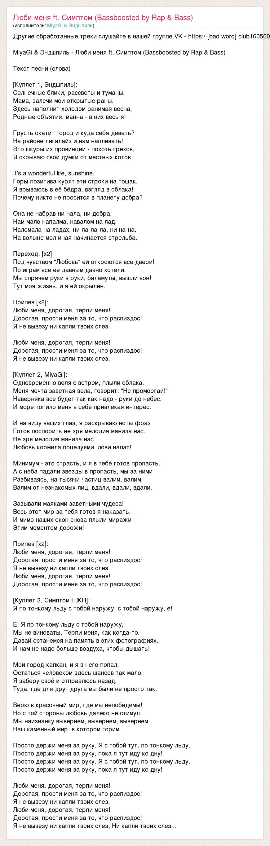 Другие обработанные треки слушайте в нашей группе VK - https:/ [bad word] club160560 MiyaGi & Эндшпиль - Люби меня ft. Симптом (Bassboosted by Rap & Bass) Текст песни (слова) [Куплет 1, Эндшпиль]: Солнечные блики, рассветы и туманы. Мама, залечи мои открытые раны. Здесь наполнит холодом ранимая весна, Родные объятия, манна - в них весь я! Грусть окатит город и куда себя девать? На районе лигалайз и нам наплевать! Это шкуры из провинции - похоть грехов, Я скрываю свои думки от местных котов. It’s a wonderful life, sunshine. Горы позитива курят эти строки на тощак. Я врываюсь в её бёдра, взгляд в облака! Почему никто не просится в планету добра? Она не набрав ни нала, ни добра, Нам мало напалма, навалом на лад. Наломала на ладах, ни ла-ла-ла, ни на-на. На волыне мол иная начинается стрельба. Переход: [х2] Под чувством "Любовь" ей откроются все двери! По играм все ее давным давно хотели. Мы спрячем руки в руки, баламуты, вышли вон! Тут моя жизнь, и я ей окрылён. Припев [х2]: Люби меня, дорогая, терпи меня! Дорогая, прости меня за то, что распиздос! Я не вывезу ни капли твоих слез. Люби меня, дорогая, терпи меня! Дорогая, прости меня за то, что распиздос! Я не вывезу ни капли твоих слез. [Куплет 2, MiyaGi]: Одновременно воля с ветром, плыли облака. Меня мечта заветная вела, говорит: "Не проморгай!" Наверняка все будет так как надо - руки до небес, И море топило меня в себе привлекая интерес. И на виду ваших глаз, я раскрываю ноты фраз Готов поспорить не зря мелодия манила нас. Не зря мелодия манила нас. Любовь кормила поцелуями, лови напас! Минимум - это страсть, и я в тебе готов пропасть. А с неба падали звезды в пропасть, мы за ними Разбиваясь, на тысячи частиц валим, валим, Валим от незнакомых лиц, вдали, вдали, вдали. Зазывали маяками заветными чудеса! Весь этот мир за тебя готов я наказать. И мимо наших окон снова плыли миражи - Этим моментом дорожи! Припев [х2]: Люби меня, дорогая, терпи меня! Дорогая, прости меня за то, что распиздос! Я не вывезу ни капли твоих слез. Люби меня, дорогая, терпи меня! Дорогая, прости меня за то, что распиздос! [Куплет 3, Симптом НЖН]: Я по тонкому льду с тобой наружу, с тобой наружу, е! Е! Я по тонкому льду с тобой наружу, Мы не виноваты. Терпи меня, как когда-то. Давай останемся на память в этих фотографиях. И нам не надо больше воздуха, чтобы дышать! Мой город-капкан, и я в него попал. Остаться человеком здесь шансов так мало. Я заберу своё и отправлюсь назад, Туда, где для друг друга мы были не просто так. Верю в красочный мир, где мы непобедимы! Но с той стороны любовь далеко не стимул. Мы наизнанку вывернем, вывернем, вывернем Наш каменный мир, в котором горим... Просто держи меня за руку. Я с тобой тут, по тонкому льду. Просто держи меня за руку, пока я тут иду ко дну! Просто держи меня за руку. Я с тобой тут, по тонкому льду. Просто держи меня за руку, пока я тут иду ко дну! Люби меня, дорогая, терпи меня! Дорогая, прости меня за то, что распиздос! Я не вывезу ни капли твоих слез. Люби меня, дорогая, терпи меня! Дорогая, прости меня за то, что распиздос! Я не вывезу ни капли твоих слез; Ни капли твоих слез...
