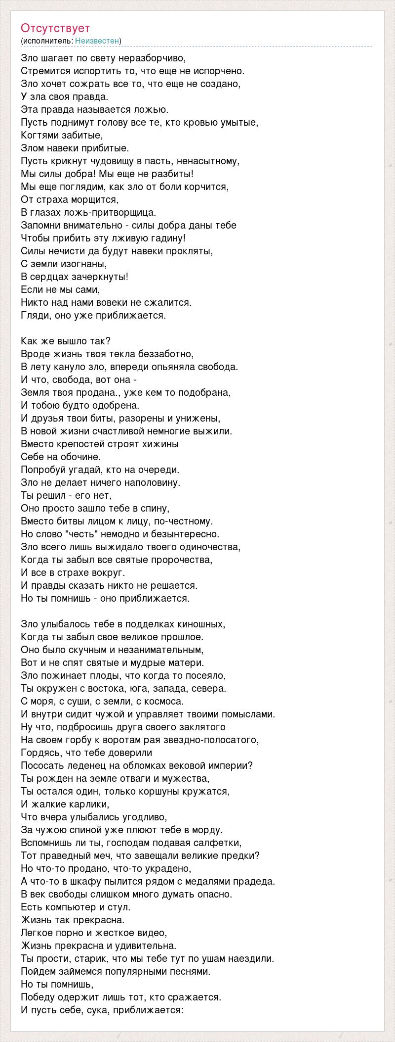 Зло шагает по свету неразборчиво, Стремится испортить то, что еще не испорчено. Зло хочет сожрать все то, что еще не создано, У зла своя правда. Эта правда называется ложью. Пусть поднимут голову все те, кто кровью умытые, Когтями забитые, Злом навеки прибитые. Пусть крикнут чудовищу в пасть, ненасытному, Мы силы добра! Мы еще не разбиты! Мы еще поглядим, как зло от боли корчится, От страха морщится, В глазах ложь-притворщица. Запомни внимательно - силы добра даны тебе Чтобы прибить эту лживую гадину! Силы нечисти да будут навеки прокляты, С земли изогнаны, В сердцах зачеркнуты! Если не мы сами, Никто над нами вовеки не сжалится. Гляди, оно уже приближается. Как же вышло так? Вроде жизнь твоя текла беззаботно, В лету кануло зло, впереди опьяняла свобода. И что, свобода, вот она - Земля твоя продана., уже кем то подобрана, И тобою будто одобрена. И друзья твои биты, разорены и унижены, В новой жизни счастливой немногие выжили. Вместо крепостей строят хижины Себе на обочине. Попробуй угадай, кто на очереди. Зло не делает ничего наполовину. Ты решил - его нет, Оно просто зашло тебе в спину, Вместо битвы лицом к лицу, по-честному. Но слово "честь" немодно и безынтересно. Зло всего лишь выжидало твоего одиночества, Когда ты забыл все святые пророчества, И все в страхе вокруг. И правды сказать никто не решается. Но ты помнишь - оно приближается. Зло улыбалось тебе в подделках киношных, Когда ты забыл свое великое прошлое. Оно было скучным и незанимательным, Вот и не спят святые и мудрые матери. Зло пожинает плоды, что когда то посеяло, Ты окружен с востока, юга, запада, севера. С моря, с суши, с земли, с космоса. И внутри сидит чужой и управляет твоими помыслами. Ну что, подбросишь друга своего заклятого На своем горбу к воротам рая звездно-полосатого, Гордясь, что тебе доверили Пососать леденец на обломках вековой империи? Ты рожден на земле отваги и мужества, Ты остался один, только коршуны кружатся, И жалкие карлики, Что вчера улыбались угодливо, За чужою спиной уже плюют тебе в морду. Вспомнишь ли ты, господам подавая салфетки, Тот праведный меч, что завещали великие предки? Но что-то продано, что-то украдено, А что-то в шкафу пылится рядом с медалями прадеда. В век свободы слишком много думать опасно. Есть компьютер и стул. Жизнь так прекрасна. Легкое порно и жесткое видео, Жизнь прекрасна и удивительна. Ты прости, старик, что мы тебе тут по ушам наездили. Пойдем займемся популярными песнями. Но ты помнишь, Победу одержит лишь тот, кто сражается. И пусть себе, сука, приближается: