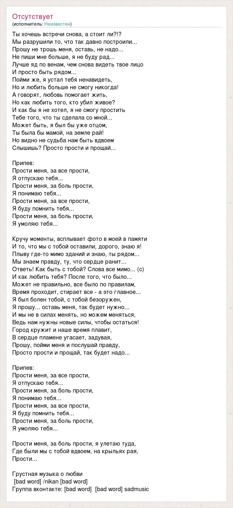 Ты хочешь встречи снова, а стоит ли?!? Мы разрушили то, что так давно построили... Прошу не трошь меня, оставь, не надо... Не пиши мне больше, я не буду рад... Лучше яд по венам, чем снова видеть твое лицо И просто быть рядом... Пойми же, я устал тебя ненавидеть, Но и любить больше не смогу никогда! А говорят, любовь помогает жить, Но как любить того, кто убил живое? И как бы я не хотел, я не смогу простить Тебе того, что ты сделала со мной... Может быть, я был бы уже отцом, Ты была бы мамой, на земле рай! Но видно не судьба нам быть вдвоем Слышишь? Просто прости и прощай... Припев: Прости меня, за все прости, Я отпускаю тебя... Прости меня, за боль прости, Я понимаю тебя... Прости меня, за все прости, Я буду помнить тебя... Прости меня, за боль прости, Я умоляю тебя... Кручу моменты, всплывает фото в моей в памяти И то, что мы с тобой оставили, дорого, знаю я! Плыву где-то мимо зданий и знаю, ты рядом... Мы знаем правду, ту, что сердце ранит... Ответь! Как быть с тобой? Слова все мимо... (с) И как любить тебя? После того, что было... Может не правильно, все было по правилам, Время проходит, стирает все - а это главное... Я был болен тобой, с тобой безоружен, Я прошу... оставь меня, так будет нужно... И мы не в силах менять, но можем меняться, Ведь нам нужны новые силы, чтобы остаться! Город кружит и наше время плавит, В сердце пламене угасает, задувая, Прошу, пойми меня и послушай правду, Просто прости и прощай, так будет надо... Припев: Прости меня, за все прости, Я отпускаю тебя... Прости меня, за боль прости, Я понимаю тебя... Прости меня, за все прости, Я буду помнить тебя... Прости меня, за боль прости, Я умоляю тебя... Прости меня, за боль прости, я улетаю туда, Где были мы с тобой вдвоем, на крыльях рая, Прости... Грустная музыка о любви [bad word] /nikan [bad word] Группа вконтакте: [bad word] [bad word] sadmusic