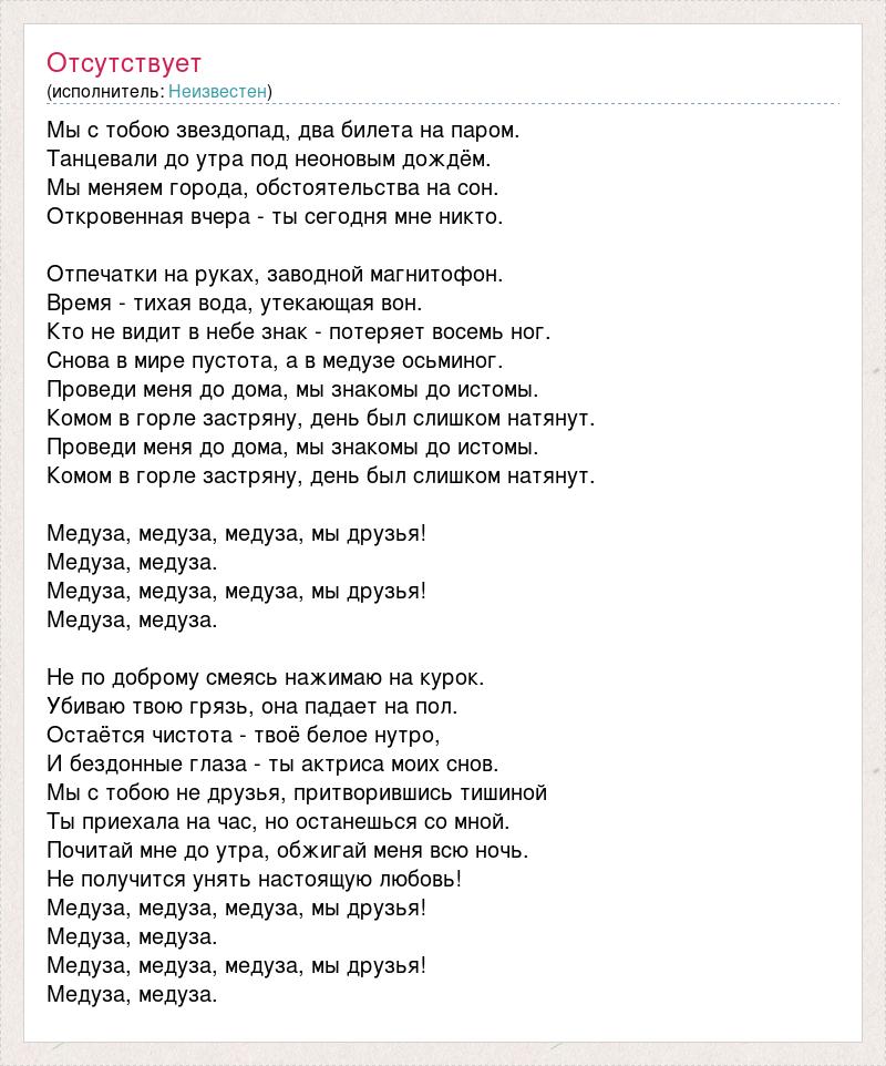 Мы с тобою звездопад, два билета на паром. Танцевали до утра под неоновым дождём. Мы меняем города, обстоятельства на сон. Откровенная вчера - ты сегодня мне никто. Отпечатки на руках, заводной магнитофон. Время - тихая вода, утекающая вон. Кто не видит в небе знак - потеряет восемь ног. Снова в мире пустота, а в медузе осьминог. Проведи меня до дома, мы знакомы до истомы. Комом в горле застряну, день был слишком натянут. Проведи меня до дома, мы знакомы до истомы. Комом в горле застряну, день был слишком натянут. Медуза, медуза, медуза, мы друзья! Медуза, медуза. Медуза, медуза, медуза, мы друзья! Медуза, медуза. Не по доброму смеясь нажимаю на курок. Убиваю твою грязь, она падает на пол. Остаётся чистота - твоё белое нутро, И бездонные глаза - ты актриса моих снов. Мы с тобою не друзья, притворившись тишиной Ты приехала на час, но останешься со мной. Почитай мне до утра, обжигай меня всю ночь. Не получится унять настоящую любовь! Медуза, медуза, медуза, мы друзья! Медуза, медуза. Медуза, медуза, медуза, мы друзья! Медуза, медуза.