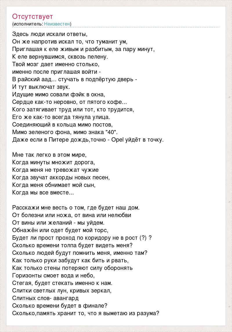 Здесь люди искали ответы, Он же напротив искал то, что туманит ум, Приглашая к еле живым и разбитым, за пару минут, К еле вернувшимся, сквозь пелену. Твой мозг дает именно столько, именно после приглашая войти - В райский аад... стучать в подпёртую дверь - И тут выключат звук. Идущие мимо совали фэйк в окна, Сердце как-то неровно, от пятого кофе... Кого затягивает труд или тот, кто трудится, Его же как-то всегда тянула улица. Соединяющий в кольца мимо постов, Мимо зеленого фона, мимо знака "40". Даже если в Питере дождь,точно - Opel уйдёт в точку. Мне так легко в этом мире, Когда минуты множит дорога, Когда меня не тревожат чужие Когда звучат аккорды новых песен, Когда меня обнимает мой сын, Когда мы все вместе... Расскажи мне весть о том, где будет наш дом. От болезни или ножа, от вина или нелюбви От вины или желаний - мы уйдем. Обнажён или одет будет мой торс, Будет ли прост проход по коридору не в рост (?) ? Сколько времени толпа будет видеть меня? Сколько людей будут помнить меня, именно там? Как только руки забудут как бить и рвать, Как только стены потеряют силу оборонять Горизонты смоет вода и небо, Стегая, будет стекать именно к нам. Слитки светлых лун, кривых зеркал, Слитных слов- авангард Сколько времени будет в финале? Сколько,память хранит то, что я выметаю из разума?