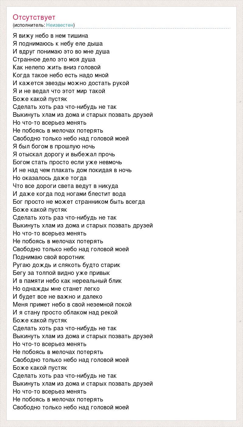 Я вижу небо в нем тишина Я поднимаюсь к небу еле дыша И вдруг понимаю это во мне душа Странное дело это моя душа Как нелепо жить вниз головой Когда такое небо есть надо мной И кажется звезды можно достать рукой Я и не ведал что этот мир такой Боже какой пустяк Сделать хоть раз что-нибудь не так Выкинуть хлам из дома и старых позвать друзей Но что-то всерьез менять Не побоясь в мелочах потерять Свободно только небо над головой моей Я был богом в прошлую ночь Я отыскал дорогу и выбежал прочь Богом стать просто если уже невмочь И не над чем плакать дом покидая в ночь Но оказалось даже тогда Что все дороги света ведут в никуда И даже когда под ногами блестит вода Бог просто не может странником быть всегда Боже какой пустяк Сделать хоть раз что-нибудь не так Выкинуть хлам из дома и старых позвать друзей Но что-то всерьез менять Не побоясь в мелочах потерять Свободно только небо над головой моей Поднимаю свой воротник Ругаю дождь и слякоть будто старик Бегу за толпой видно уже привык И в памяти небо как нереальный блик Но однажды мне станет легко И будет все не важно и далеко Меня примет небо в свой неземной покой И я стану просто облаком над рекой Боже какой пустяк Сделать хоть раз что-нибудь не так Выкинуть хлам из дома и старых позвать друзей Но что-то всерьез менять Не побоясь в мелочах потерять Свободно только небо над головой моей Боже какой пустяк Сделать хоть раз что-нибудь не так Выкинуть хлам из дома и старых позвать друзей Но что-то всерьез менять Не побоясь в мелочах потерять Свободно только небо над головой моей